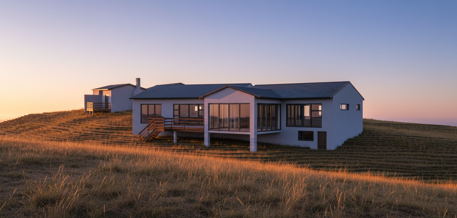 full stone front white black standing seam metal roof block windows and door exteriors concrete driveway armored stone retaining wall built to the right side of the main entry to keep the driveway higher flower bed on the right half of the house give me some flowers and shrubs on the right side of the picture give me a dusk view in the fall