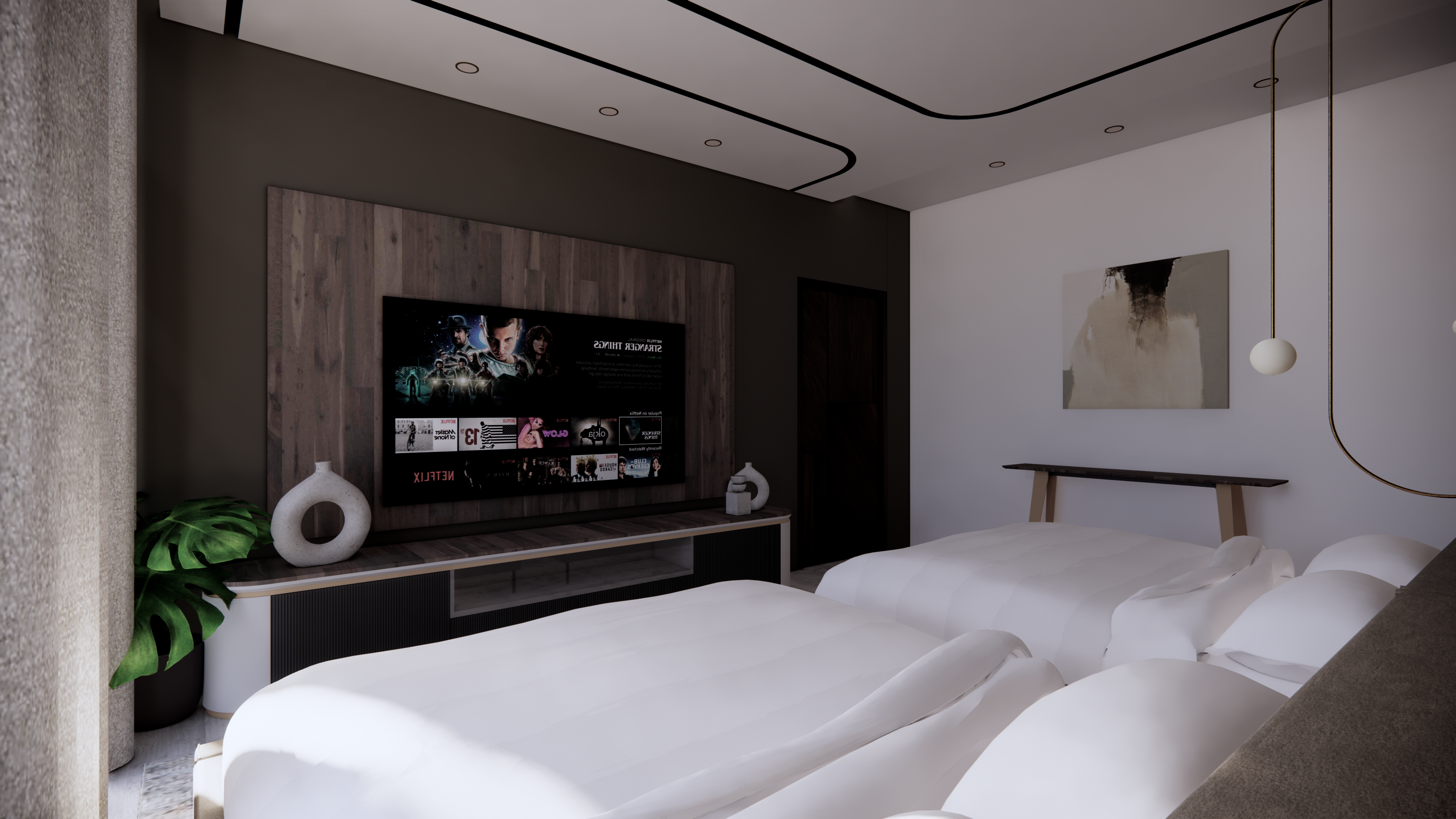 render a modern bedroom interior with a sleek minimalist design the room features a large wall mounted flat screen tv surrounded by a dark wood panel the wall is painted in a soft muted taupe color below the tv a contemporary console in black and wood tones holds decorative sculptures on the left a lush green plant adds a touch of nature the bed is dressed in crisp white linens inviting and serene a large abstract painting in neutral tones hangs on the right wall light gray walls and a white ceiling with black stripe accents complete the scene the atmosphere is calming and sophisticated with warm soft light illuminating the room