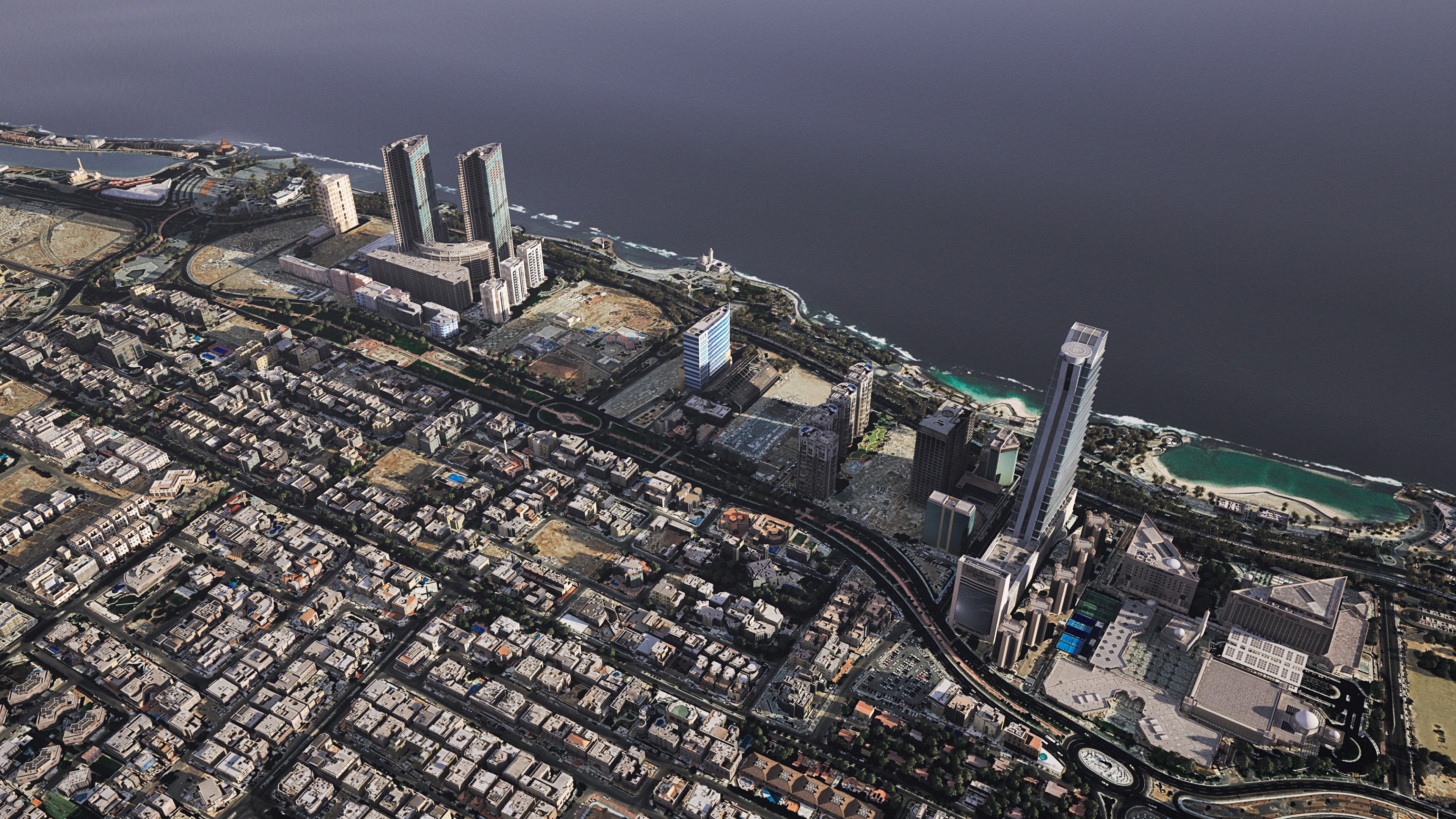 keep all building design lighting sun and shadow direction enhance only the water body and coastal area to be photorealistic