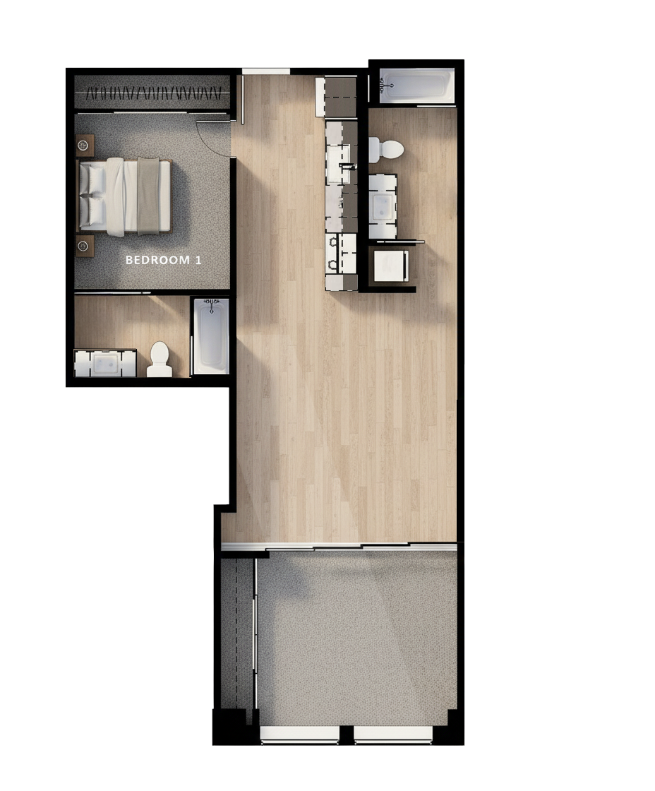 furnish the bedroom in this floor plan with realistic high quality top view furniture add a complete bedroom layout bed nightstands lamps and a small living room setup chairs coffee table tv stand rug then right behind it put a small kitchen table and chairs match the proportions and room sizes exactly use ultra realistic materials clean shadows crisp edges and neutral daylight keep walls doors and flooring unchanged match the polished professional style of commercial apartment floor plan renders
