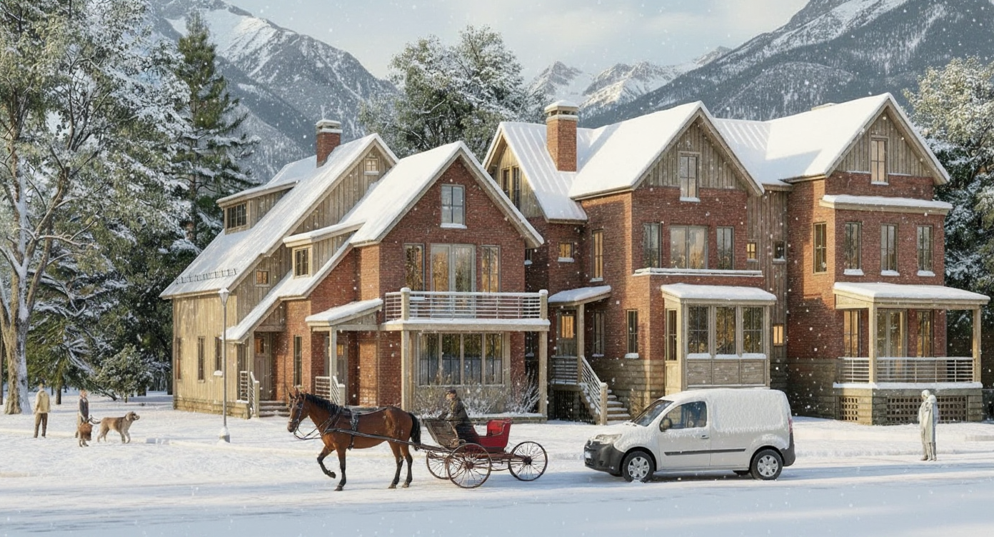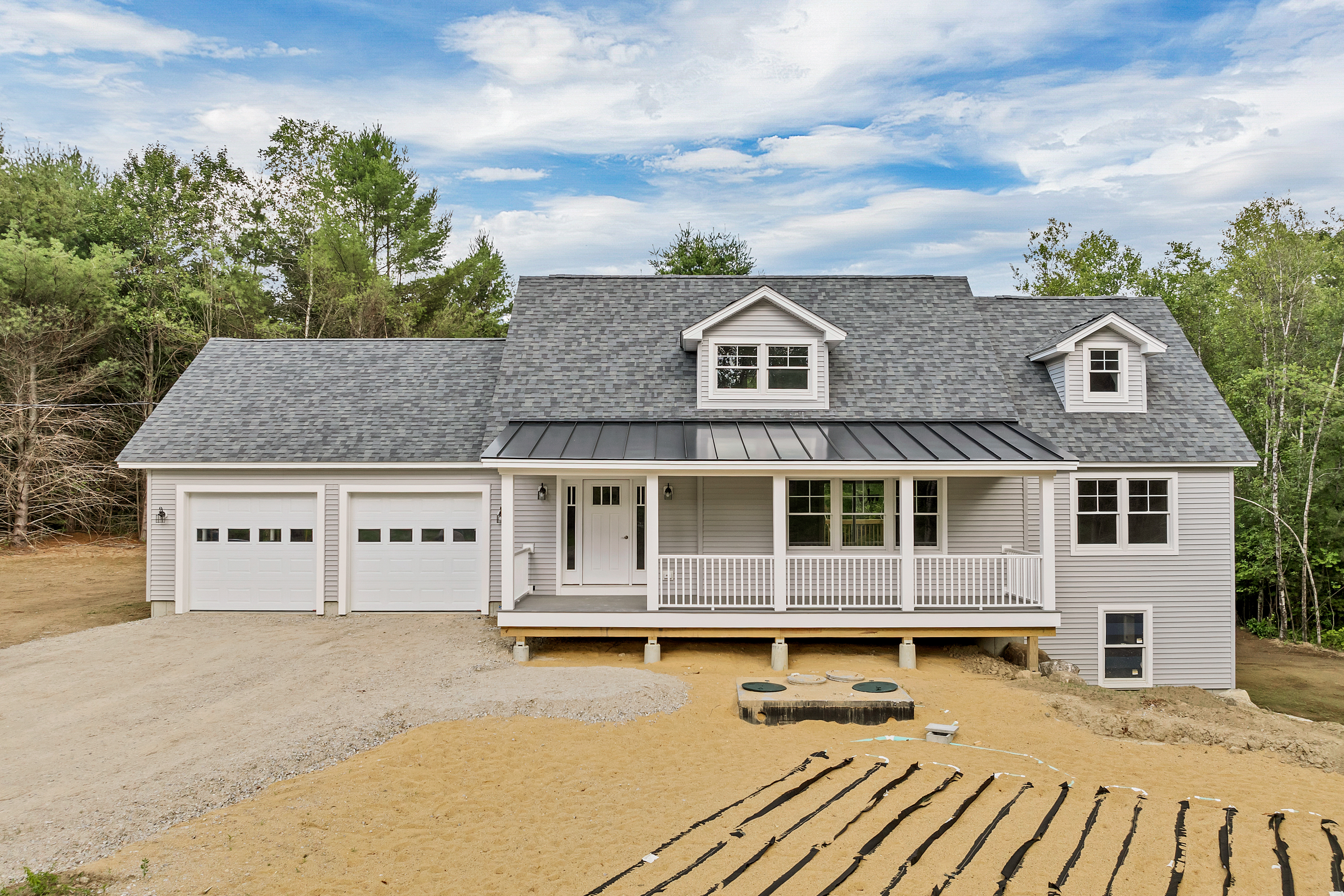 a fresh layer of snow over the grass and roof paved driveway