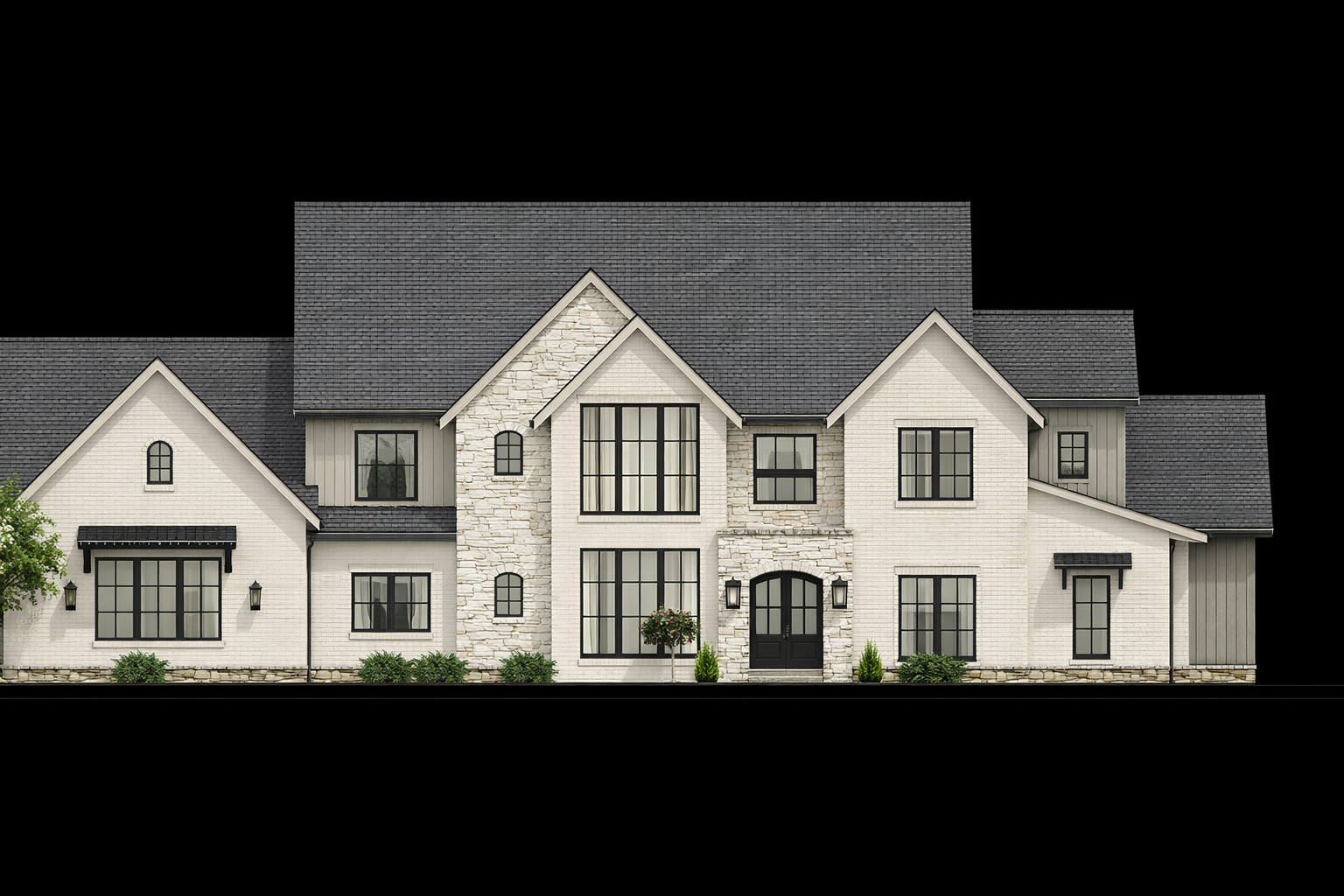 turn this into a 4k photorealistic image with a wooded backyard paint siding in adaptive shade by sherwin williams