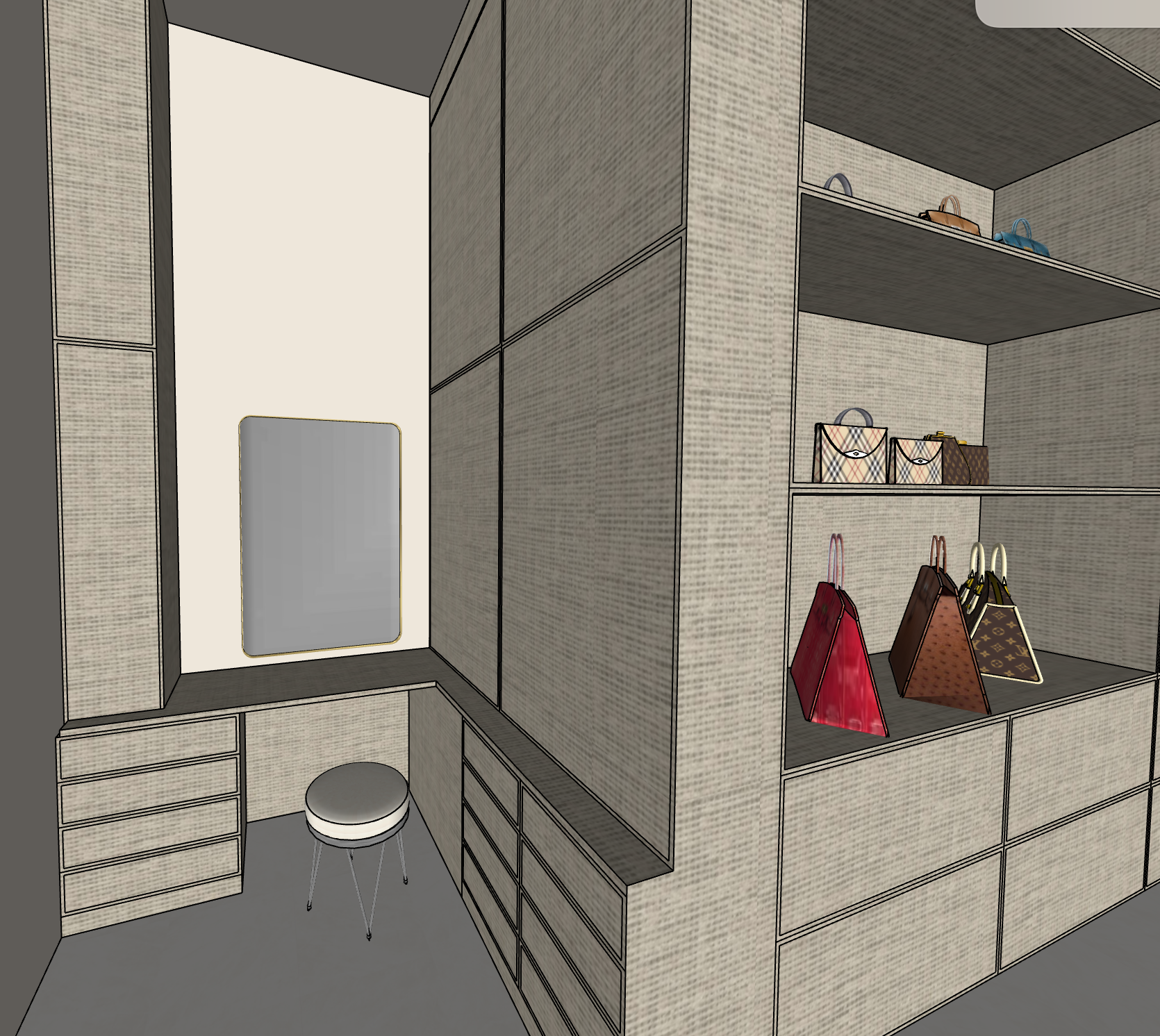 render a luxurious woman s walk in closet featuring sleek modern cabinetry with a light beige linen finish use warm ambient lighting to evoke a cozy and inviting atmosphere the floor should be a smooth matte ivory tile add brass handles for a touch of sophistication the overall vibe should be elegant and serene with a focus on luxury and organization