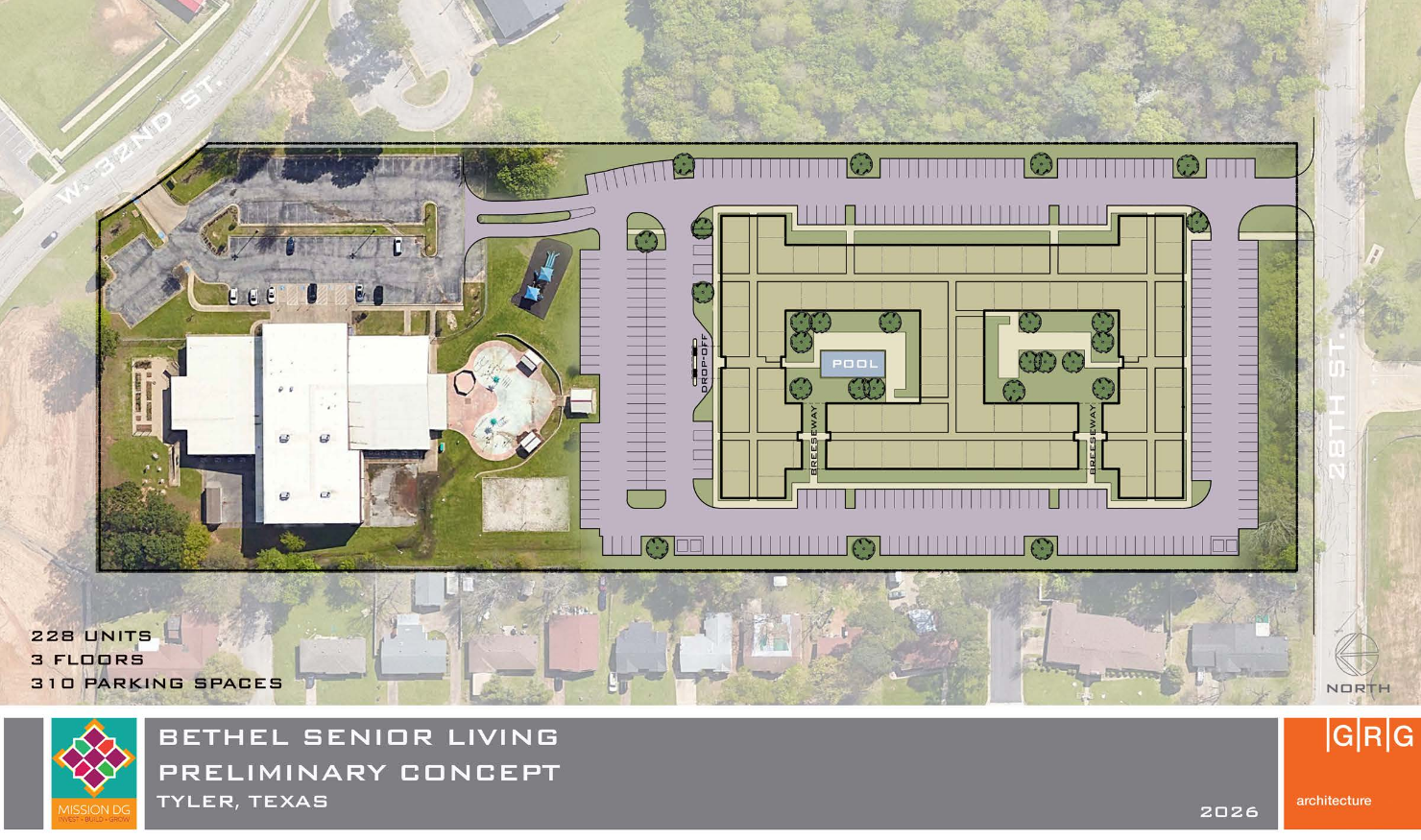 generate a high quality architectural rendering from a 2d site plan of a multi building apartment complex designed for senior housing in austin texas important maintain the exact building footprints site geometry and layout from the provided 2d plan do not reinterpret or redesign the layout only translate it into a 3d rendering with enhanced architectural detail materials and environment the development should reflect a blend of modern and garden style apartment design creating a warm inviting and human scaled environment appropriate for senior living site layout low rise 3 story buildings arranged around landscaped courtyards and walking paths emphasis on accessibility clear circulation and community spaces include covered drop off zones and clearly defined building entries surface parking integrated into the site at approximately 1 1 5 spaces per unit with shaded parking structures 10 carports and trees accessibility compliance fully ada compliant design and fair housing accessibility considerations wide smooth walking paths with minimal slopes and no abrupt grade changes accessible routes connecting parking units and amenities ramps integrated naturally into the design no institutional feel architectural style hybrid of modern garden style clean lines softened with residential character material palette board and batten fiber cement siding light stucco stone accents and warm wood details sloped roofs with modest overhangs some flat only roofs are ok senior friendly design features frequent seating areas along walking paths shaded rest areas pergolas and breezeways community garden and passive outdoor gathering spaces clear visible signage and welcoming building entrances landscape environment austin context native texas landscaping live oaks ornamental grasses drought tolerant planting incorporate limestone elements typical of central texas design for heat mitigation with shade and airflow lighting mood late afternoon golden hour lighting warm tones soft shadows inviting and calm atmosphere rendering style photorealistic with high detail slightly stylized for architectural presentation not overly conceptual include people senior residents walking sitting interacting to show scale and livability camera views primary angled aerial perspective showing full site layout and relationships secondary pedestrian level view highlighting entries landscaping and accessibility features overall feel comfortable safe and community oriented high quality but not luxury driven emphasize dignity independence and ease of living for senior residents