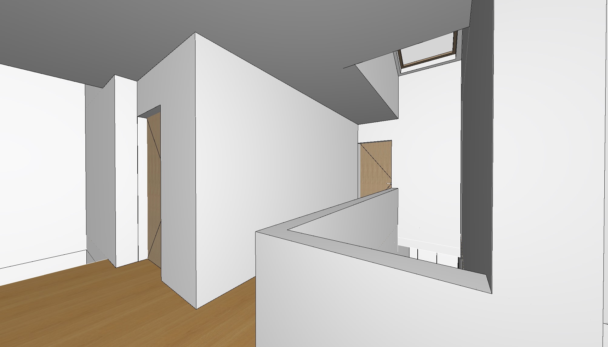 a hallway illuminated with natural light from above featuring light oak wood floors and white walls