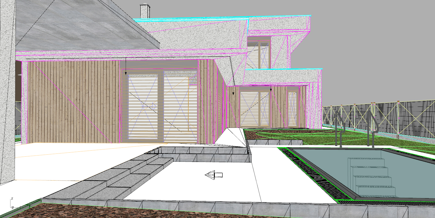 render a photorealistic 3d perspective of this house in a slovakia reference the current material style just enhance them keep model geometry the same windows doors roof walls garage door pavement driveway make a lush vegetation that looks native make the most realistic wooden cladding the color of the window and door frames is ral 7030 the facade of the house has white silicone scraped plaster make water in stainless steel pool more realistic there is a spillway around the pool the fence is anthracite in color with a green shading fabric placed on the fence do not change the view only enhance the current materials and make the landscape nicer vegetation detailed textures in the wood siding and glass reflections and a vibrant clear sky with light atmospheric depth render in hyper realistic architectural visualization quality 8k resolution