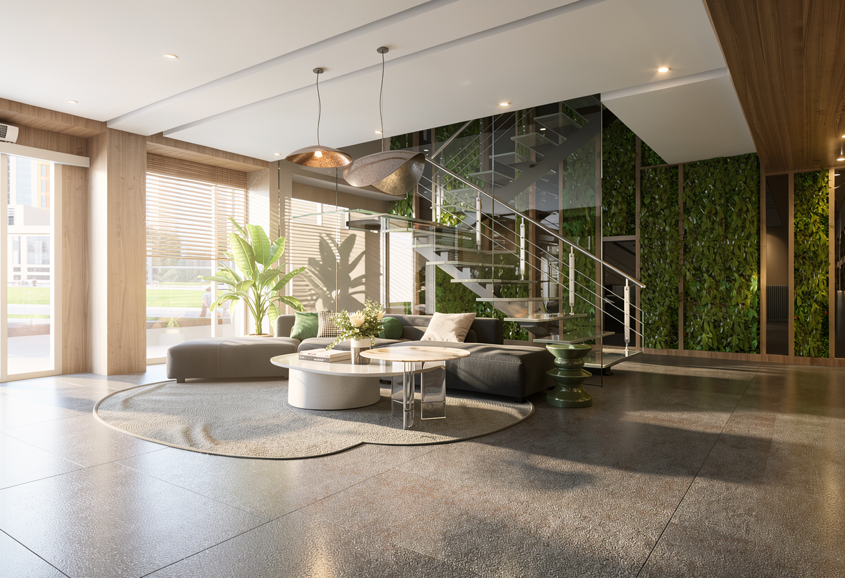 add modern garden with some grass and a wooden fence on the left side