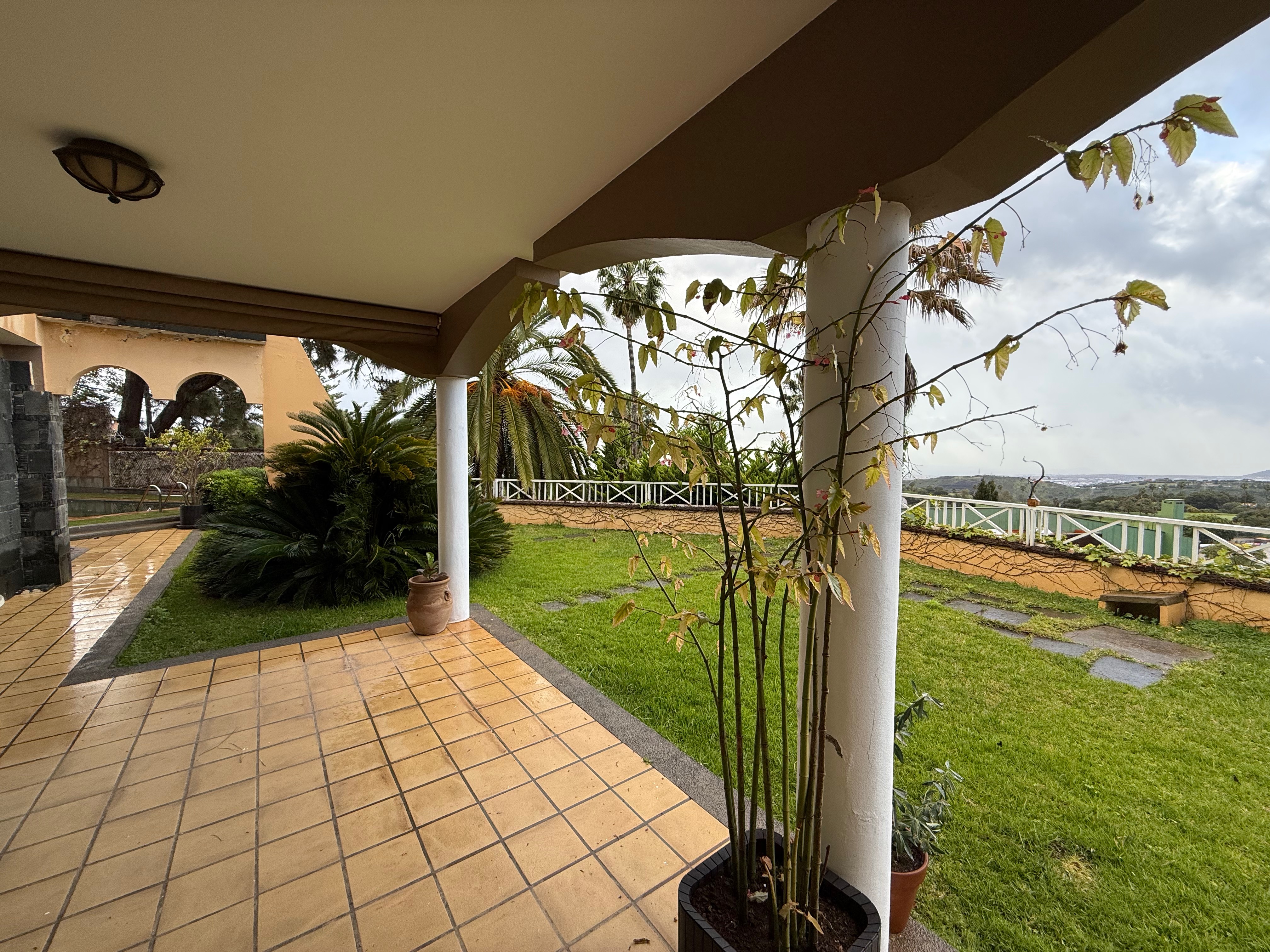 the scene is the covered porch of my house with a swimming pool in the background it s summer and my family three daughters and their parents are enjoying the pool and a barbecue the father is preparing there s greenery grass flowers hammocks and so on under the porch are the barbecue and outdoor tables and chairs it s a sunny day