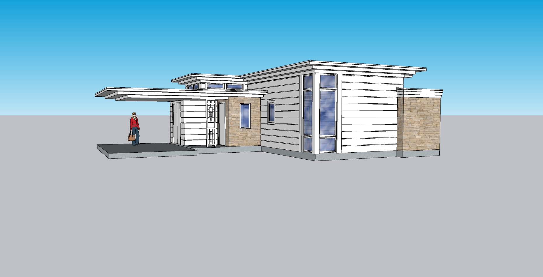 modern minimalist house with clean lines and a flat roof exterior walls are cinnabar color with horizontal paneling accented by sections of light texas cream limestone for texture windows are large with reflective slightly tinted glass giving a sleek appearance the overhang fascia is cinnabar color with light cream soffit casting soft shadows the ground is a smooth light gray concrete set in the texas hill country surrounded by native live oak trees and vegetation the sky is a vibrant gradient from bright blue to soft light blue suggesting a clear sunny day atmosphere is warm and inviting with a sense of tranquility and openness