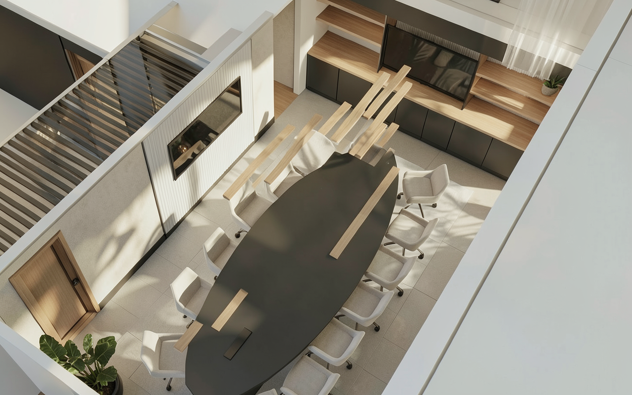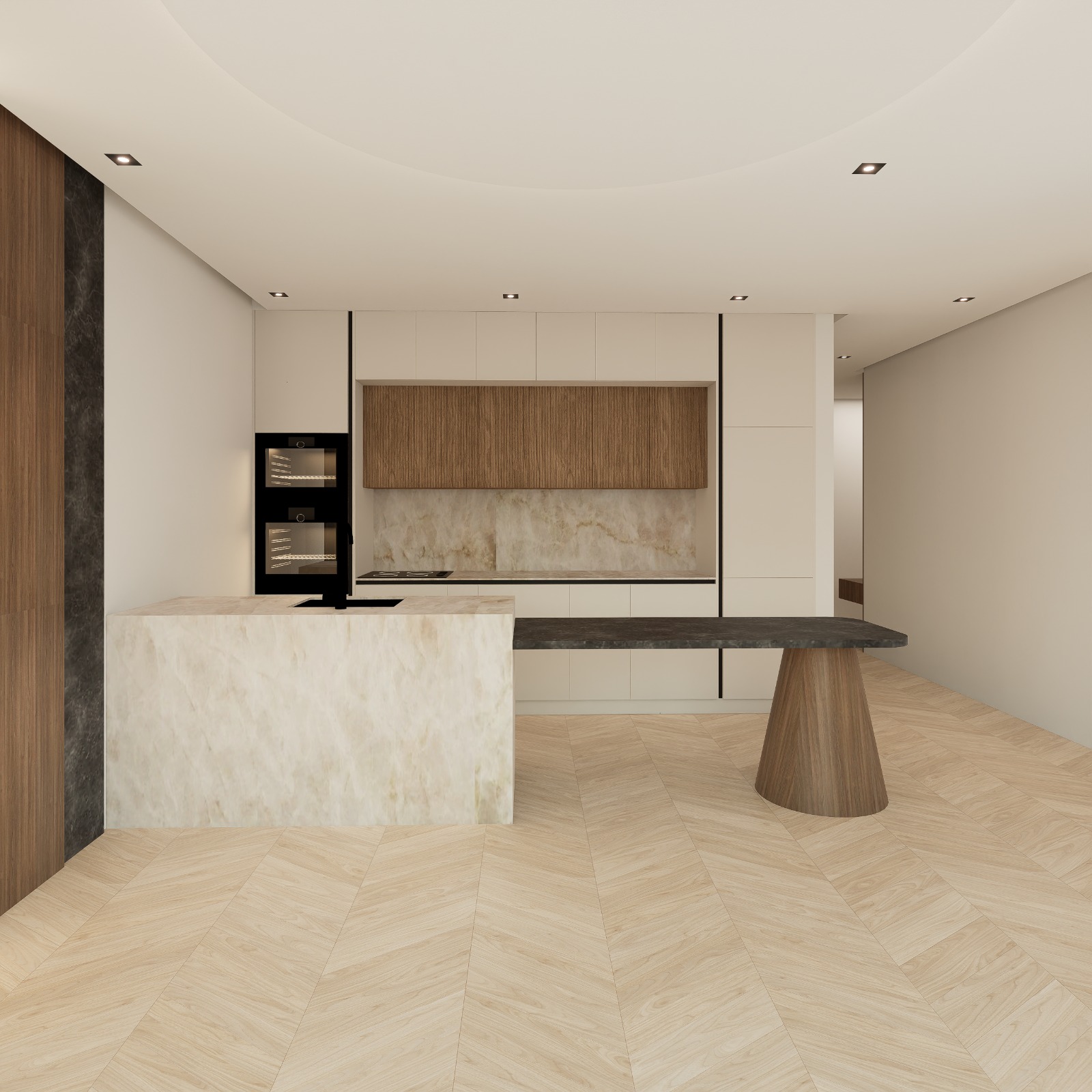 ultra photorealistic modern luxury kitchen interior preserve the exact layout architecture ceiling design cabinet positions island placement and proportions from the original render do not modify the structure of the kitchen enhance the materials and styling to match a high end modern kitchen aesthetic with dark marble accents warm wood textures and elegant dining integration inspired by contemporary architectural visualization kitchens the kitchen island should feature a premium natural beige stone surface with subtle warm veining polished but slightly matte for realism improve the stone texture with high quality pbr marble detail and natural variation the attached dining extension slab should be dark charcoal marble with soft white veining slightly thicker to appear luxurious maintain the same geometry but enhance the stone material with realistic reflections and edge detailing the table base should remain the same shape but finished in warm walnut wood veneer with natural grain matching the upper cabinetry tones add four modern luxury dining chairs around the island extension chairs should have soft curved armchair design upholstered taupe or beige leather fabric thin black metal legs elegant modern dining style matching high end interior kitchens enhance the cabinet materials main cabinets in warm off white matte lacquer upper accent cabinet in natural walnut wood veneer integrated handleless modern panels the backsplash and wall surface behind the cooktop should appear as light natural stone slab with subtle texture and warm tones improve lighting realism soft warm recessed ceiling spotlights 3000k gentle ambient indirect lighting subtle under cabinet lighting glow realistic global illumination with soft shadows add modern pendant lighting above the island inspired by luxury kitchen interiors use minimal black or sculptural glass pendant lights suspended above the dining extension improve the floor material with high detail light oak herringbone wood flooring natural grain variation and soft reflections add subtle styling details on the island to increase realism a small stack of books ceramic tray minimal decor object elegant kitchen accessories the faucet and sink should appear matte black modern fixtures with realistic metal reflections rendering style ultra photorealistic architectural visualization global illumination cinematic interior lighting ultra detailed pbr materials natural shadows interior design magazine quality 8k detail professional corona v ray style rendering important do not change the kitchen layout do not change the ceiling design keep all cabinets and island geometry exactly the same only enhance materials furniture styling lighting and realism