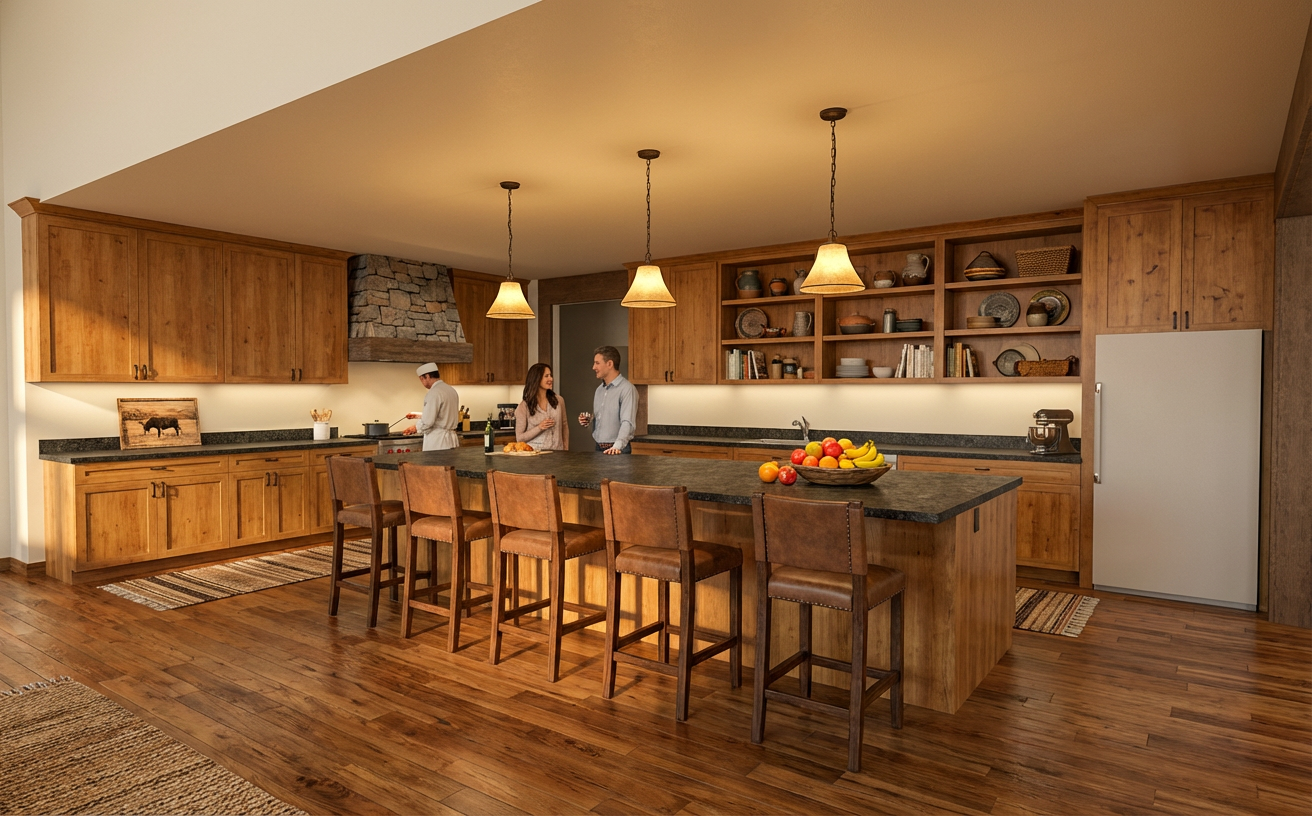 add 5 chairs make upper cabinets more interesting with some cabinet and some open shelves change the hood add people add details like a fruit bowl make like jackson hole house