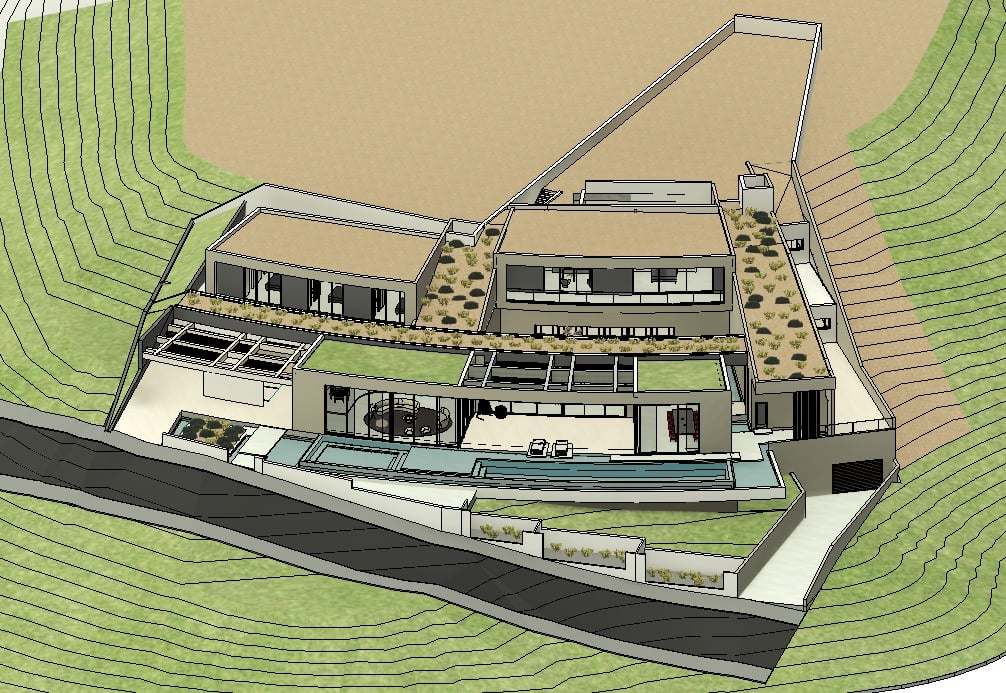transform the provided mediterenean villa exterior image into a high end photorealistic render with low plants schrubs mediterenean plants don t change any walls or windows or furniture but the materials should read realistic nice clear pool water at the front green roofs with low plants same as the surround environment onyx beige rustic for the outdoor terraces polish onyx for interior caning to fill the gaps on the slabs aboe the teracces big olive tree in the courtyard luxury cars parked on the left side 2 people swimming in the long swimming pool on the right side and 2 sitting on the left side