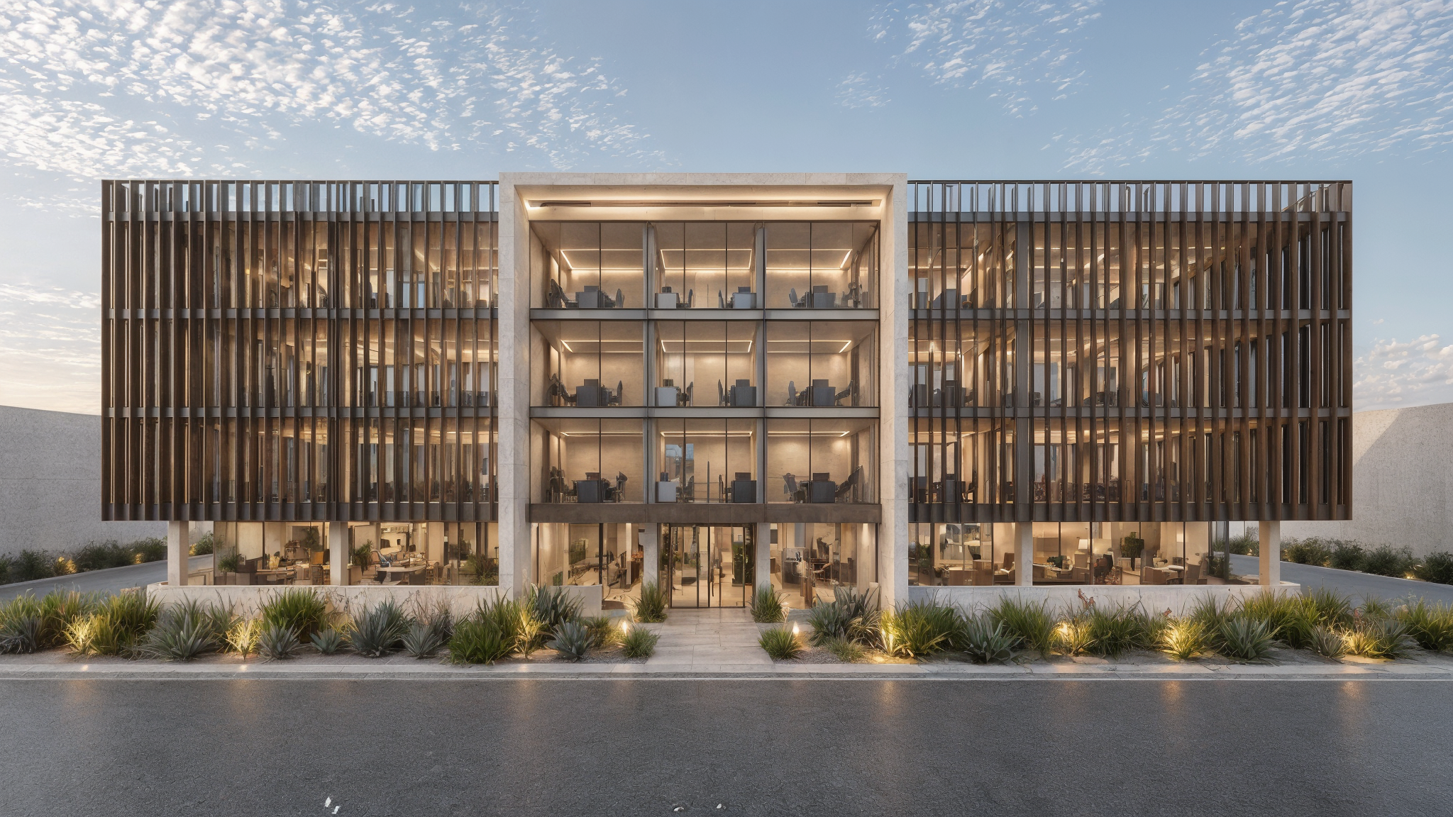 modern mid rise office or institutional building with a strong emphasis on symmetry and clean architectural lines