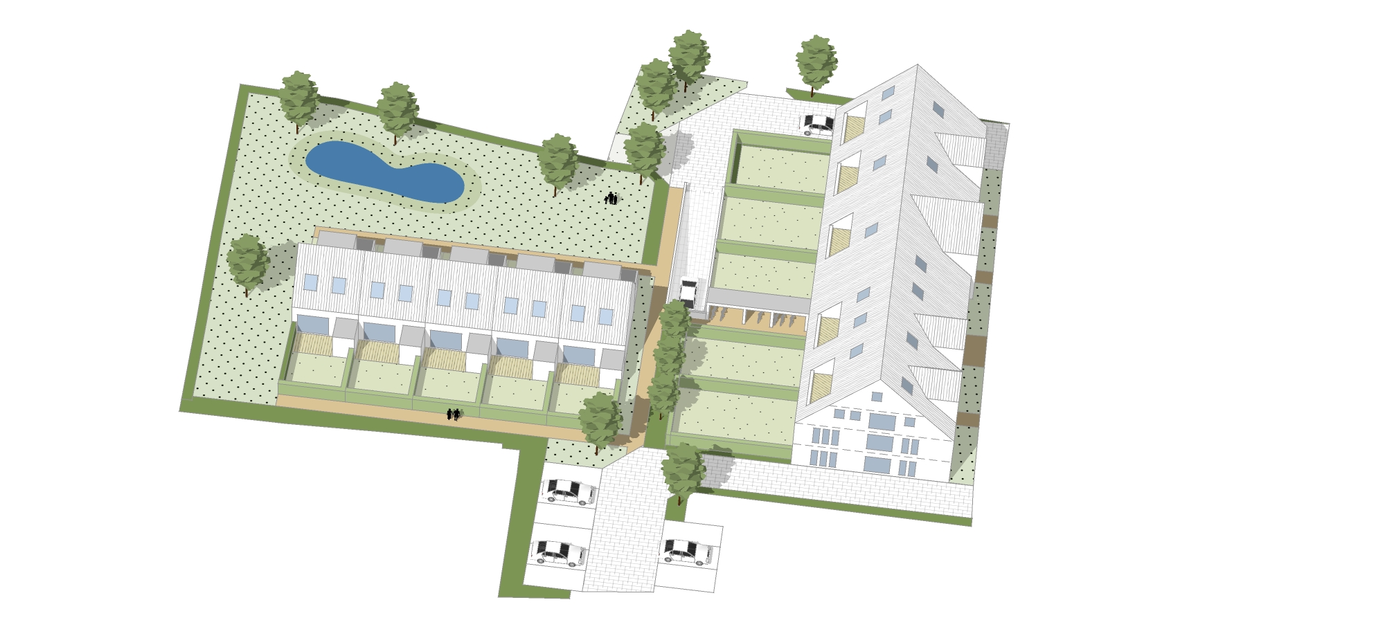 exterior shot create a photorealistic rendering of this design an ultra photorealistic architectural visualization bathed in warm soft golden hour sunlight maintain the building s volumes the facade is made of light gray bricks and natural wood panels the roofs are anthracite colored flat tiles focus on realistic textures add natural elements such as meticulously detailed green foliage blooming flowers and a perfectly manicured lawn emphasize realistic shadows and highlights creating depth and dimension the overall atmosphere should be tranquil elegant and inviting