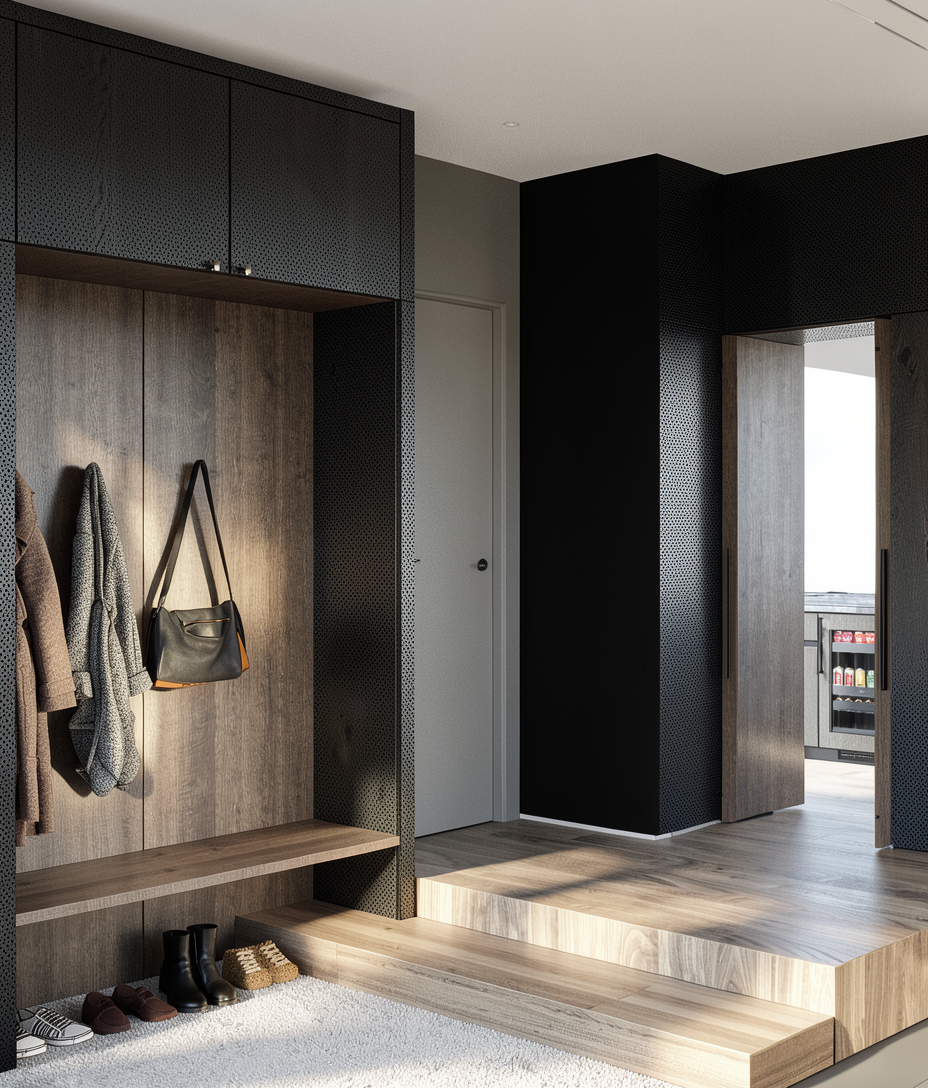 do not change the textures make the collonade light shine delicately make it blue sky sunny after rain but not too reflective make it an afternoon the top plank on the planter is timber