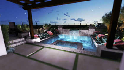ultra photorealistic nighttime architectural exterior rendering of a spanish style two story residence warm ambient landscape lighting softly illuminating mature trees layered shrubs succulents and stone hardscape realistic light falloff and shadow softness from low voltage pathway lights and wall sconces textured stucco walls with subtle imperfections realistic clay roof tiles with natural variation and dark wood balcony railings showing grain detail cinematic dusk lighting with deep blue purple sky accurate global illumination physically correct reflections and ray traced shadows high resolution materials with true to scale roughness normal maps and micro surface detail natural depth of field balanced exposure soft glow from interior windows and realistic contrast without over saturation shot on a full frame dslr look 35mm lens f 2 8 iso 800 realistic noise sharp foreground detail atmospheric realism professional architectural photography quality ultra high detail 8k resolution
