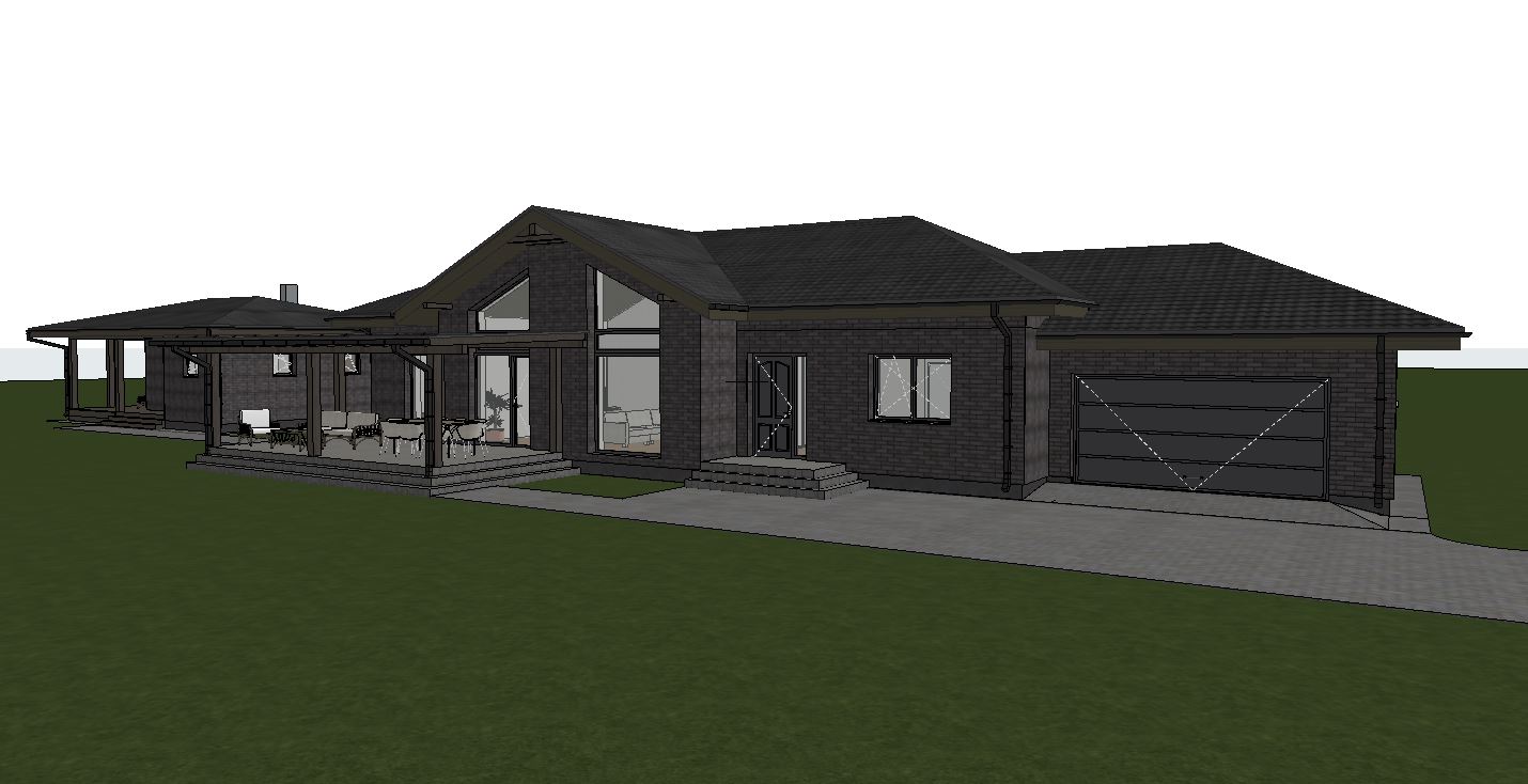 deciduous forest behind the building facades dark gray clinker roof covered with anthracite tiles