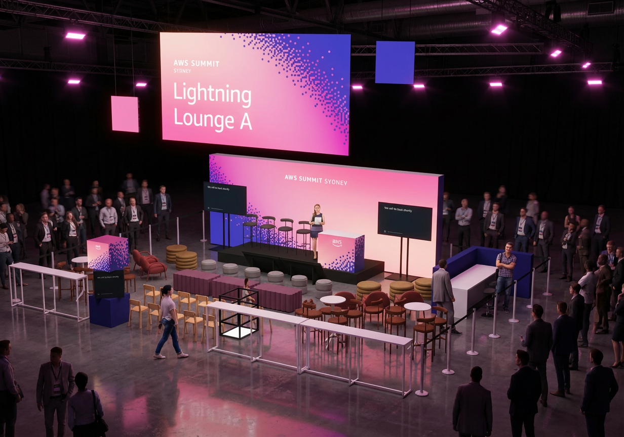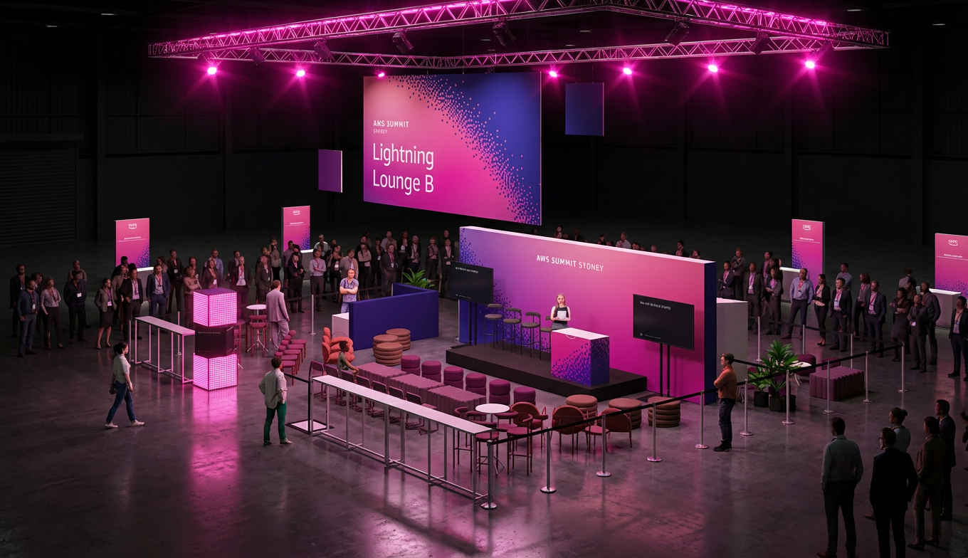 render this 3d model with realistic textures the context is an industrial expo location expos with soft pink lighting in the background with polished concrete floor extremely dark space ceiling with barely visible trusses with several bright pink lights led cube stacked boxes blurred business people with lanyard surrounding space to watch people sitting to watch do not alter the geometry and proportions of the 3d model
