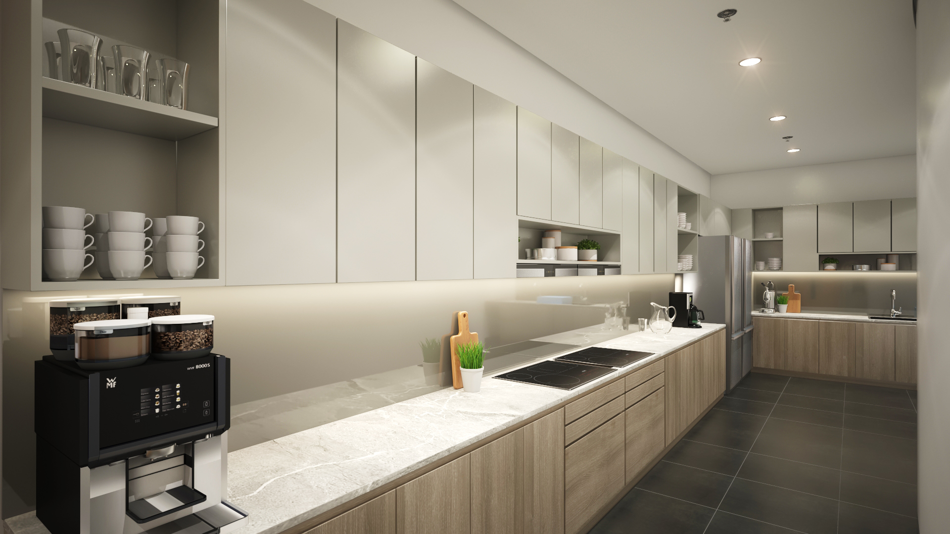 render a sleek and modern kitchen interior illuminated by soft warm lighting the cabinets are a smooth light grey paired with elegant white marble countertops the lower cabinets and drawers have a natural light wood finish the sleek dark grey tiled floor complements the overall design add subtle accents with green plants and stainless steel appliances creating a clean and minimalist atmosphere the ambiance should be inviting and contemporary exuding a sense of organized calmness