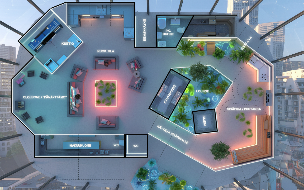 modern interior from the top make a visual floorplan with empty space remove all the functions interior shot from the top architecture