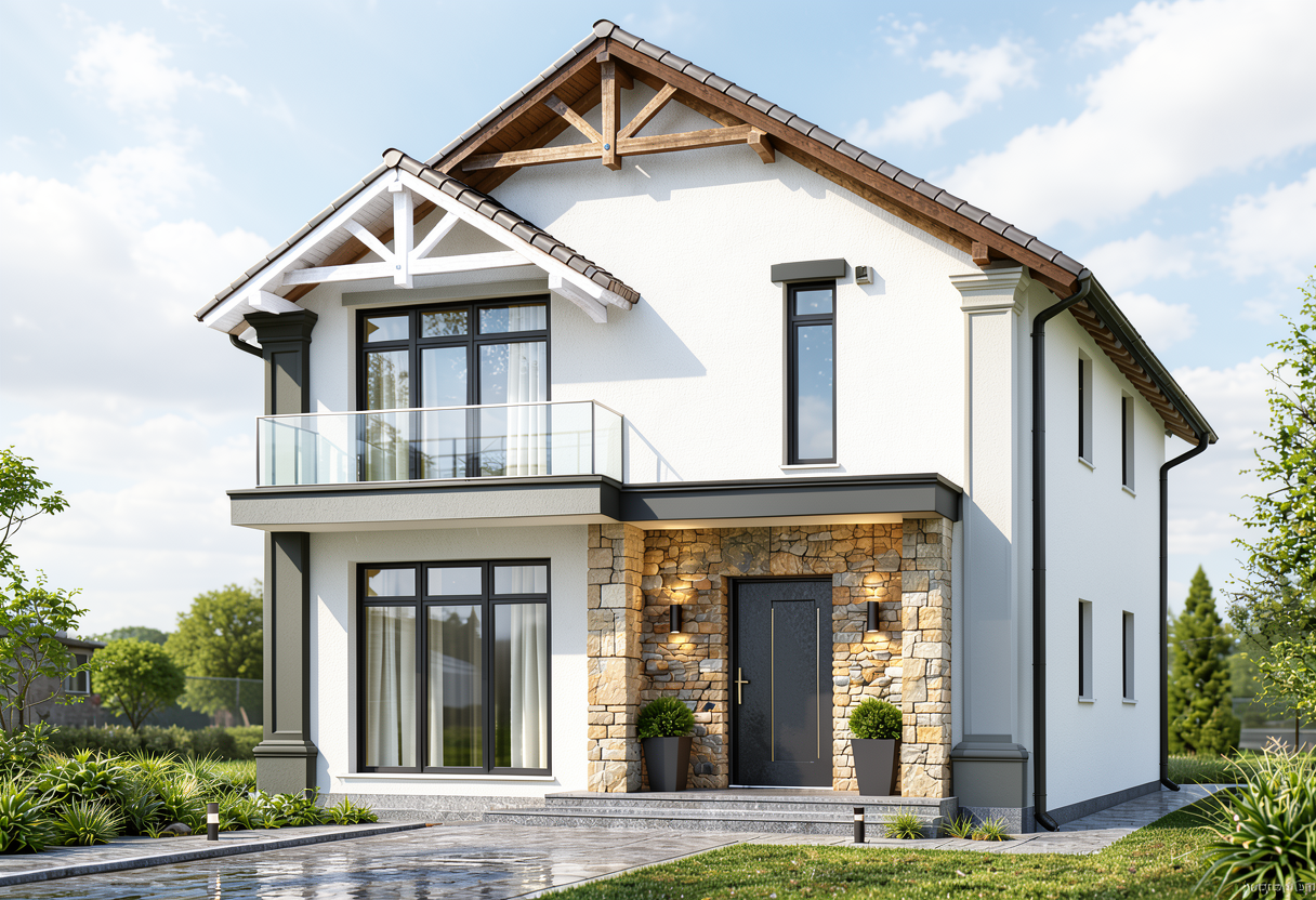 task modify the left black column to white same material just recolor to white keep shadows reflections and realism maintain thickness and geometry exactly important constraints keep the main house 100 unchanged do not redesign or reinterpret anything do not modify roof windows balcony columns or facade preserve photorealism style highly realistic architectural render clean seamless editing invisible retouching