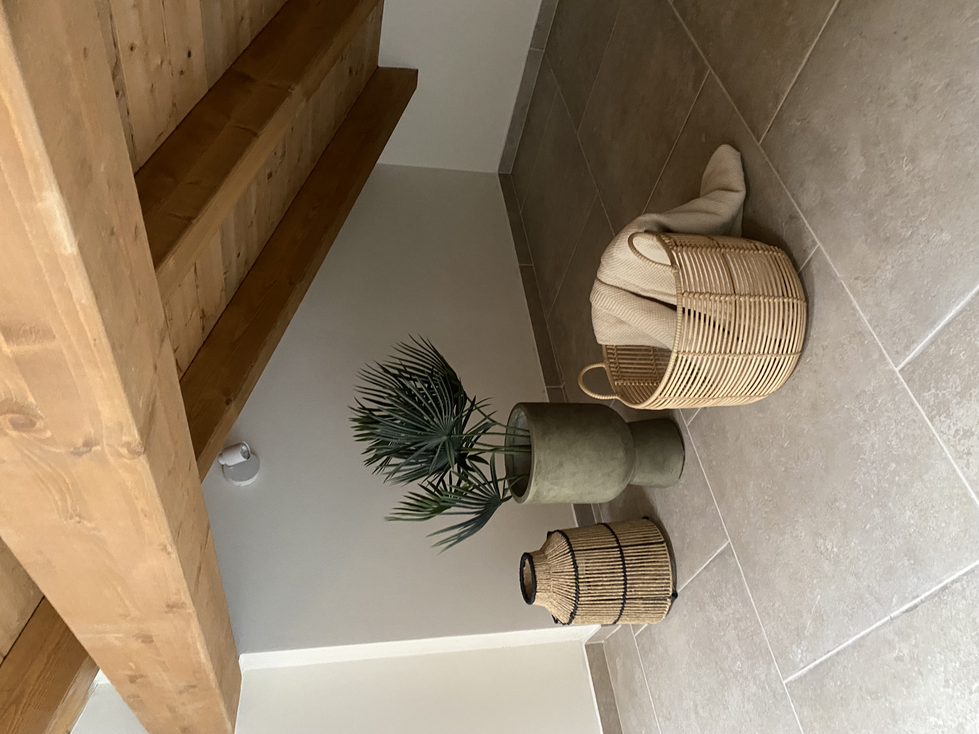 this is a real photo of a corner under a wooden sloped ceiling preserve the exact architecture beams walls and perspective refine and style the space to feel intentional and high end composition slightly reposition the existing basket plant and second basket closer together for a balanced arrangement keep all original objects add a soft neutral woven rug beige or light natural fibers under the objects optionally a very subtle decorative item small book or ceramic object enhancements make the plant slightly fuller and more vibrant green improve textures of wood beams and floor tiles slightly warm the color tones lighting add soft warm ambient light create gentle shadows for depth keep it natural not artificial keep minimal and elegant do not add furniture do not overcrowd the space the final image should look like a styled cozy corner in a high end airbnb natural and realistic make it a reading corner to sit down