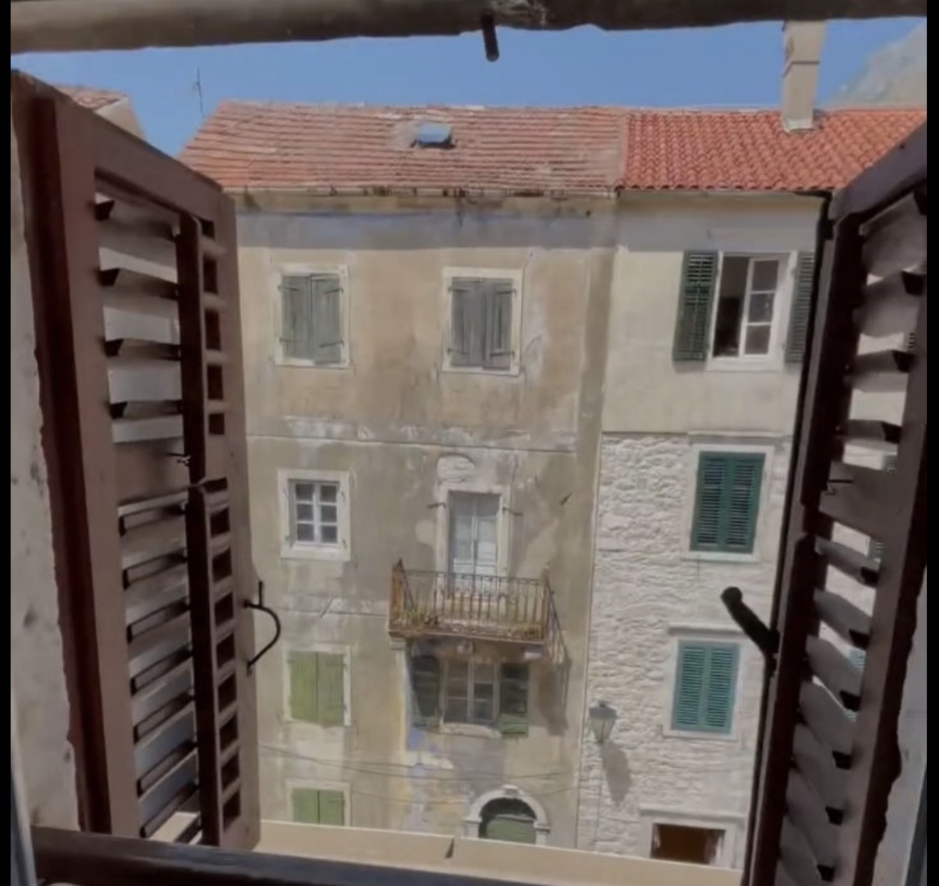 modern building with a natural stone facade and white grout between the stones add open green shutters deep green color on the windows and deep green window frames the shutters should be realistically opened and slightly angled the stone texture should be detailed and natural keep everything photorealistic with natural daylight soft shadows high detail and 4k architectural visualization