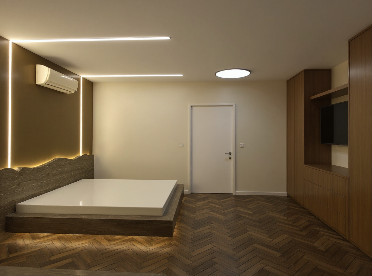 render a modern kitchen with sleek minimalist design cabinetry in matte white with subtle silver handles for a sophisticated look use a marble countertop with light grey veining the walls should be a soft dove grey creating a calming neutral atmosphere highlight the island with soft under cabinet lighting casting a warm inviting glow use dark walnut wood flooring for contrast and depth incorporate stainless steel appliances with a brushed finish the overall atmosphere is elegant tranquil and contemporary