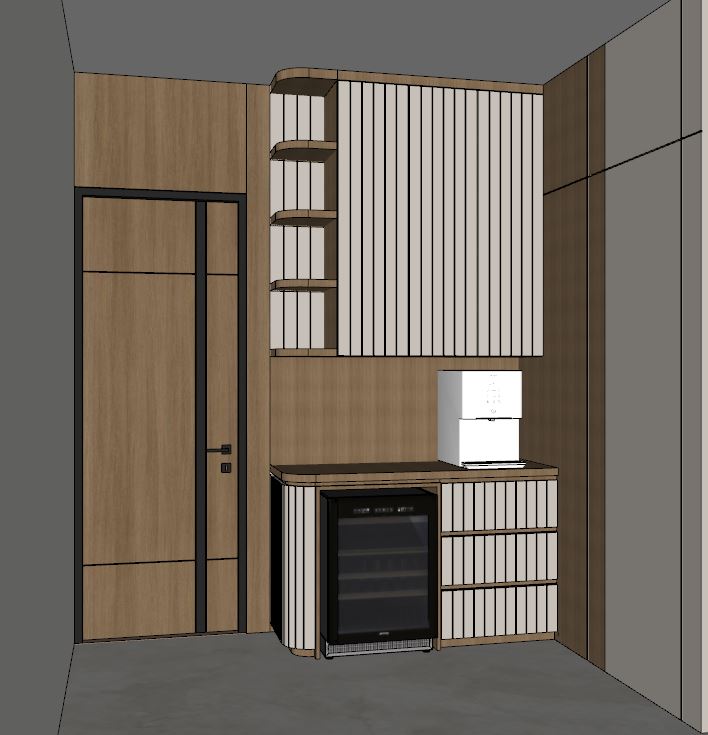 create ultra realistic images without changing any structure shape design or material do not resize the jpeg do not change the color of material use soft glossy light marble texture for the floor and add indirect light to the shelves use glossy grey marble for top table and backsplash and add decorations