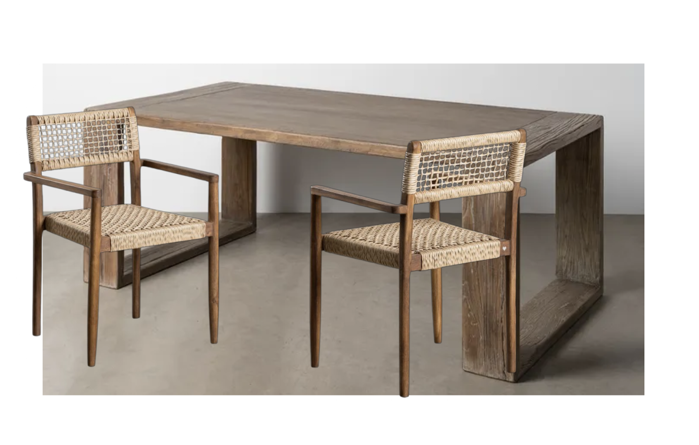 haz este conjunto real de mesa y sillas poniendo 3 sillas a una lado y 3 al otro haz que el fondo de la foto sea de estudio sin nada