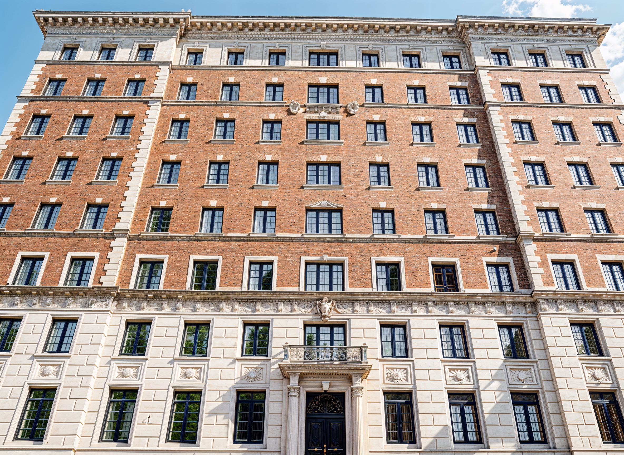 add a limestone valet canopy it will show canopy attached exactly at the top of second level lime stone band 3 window bays wide 30 ft projection two classical columns flat roof walk out terrace with black iron railing zero window or door changes