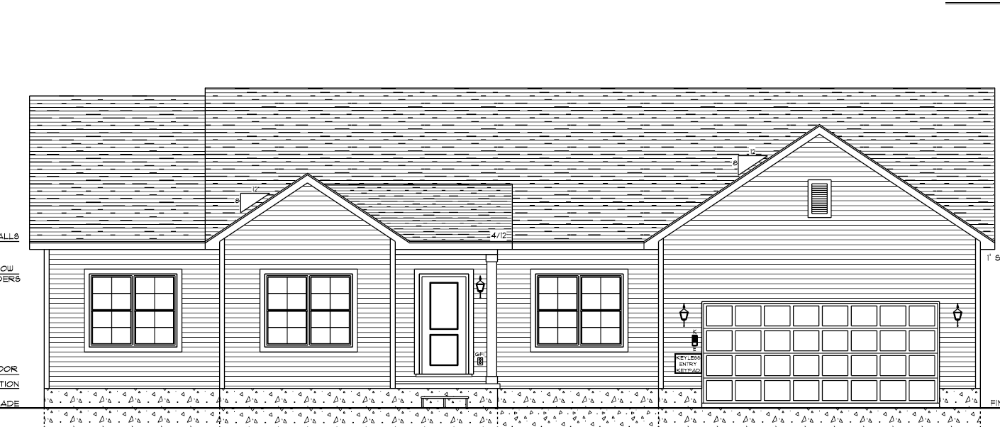 make as photorealistic as possible while keeping textures the same as selection professional landscaping in a lightly wooded scene with good lighting medium grey horizontal siding dark roof black windows white porch post to match the plan white trim and gutters white garage door match plan and a red front door with no glass