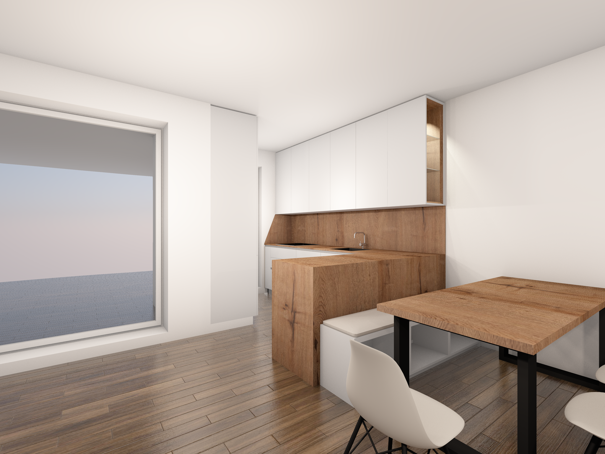white glossy finish cabinets modern kitchen real textured wood counter high detailed render moderate lightning add kitchen accessories keep original nodes