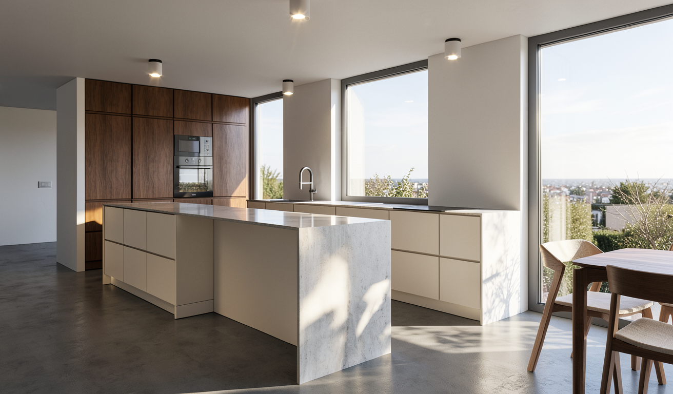 transform the provided restaurant interior image into a high end photorealistic render with warm golden hour atmosphere soft glowing highlights and relaxed upscale coastal energy