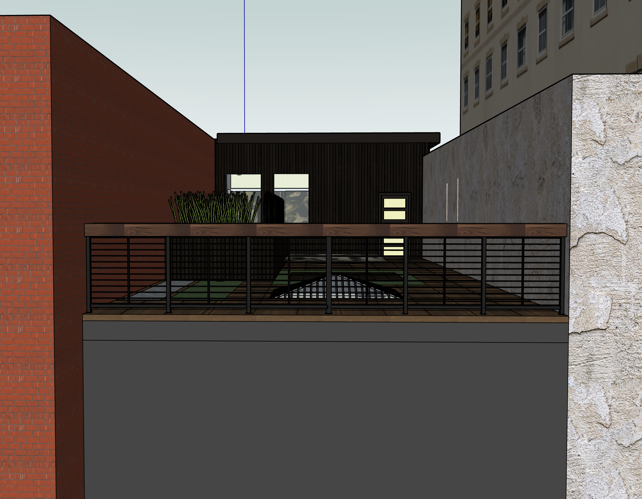 add realism railing is black steel posts with walnut top and black stainless steel cable railing