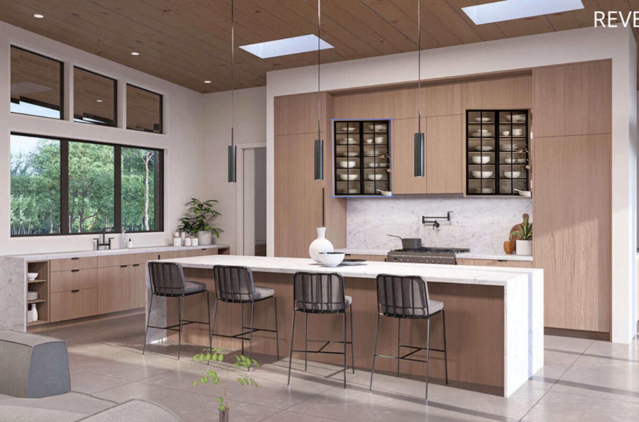 make this into a kitchen image with the floors a light cool walnut medium brown and then make the backsplash and countertops a sage green cream brown gold black stone