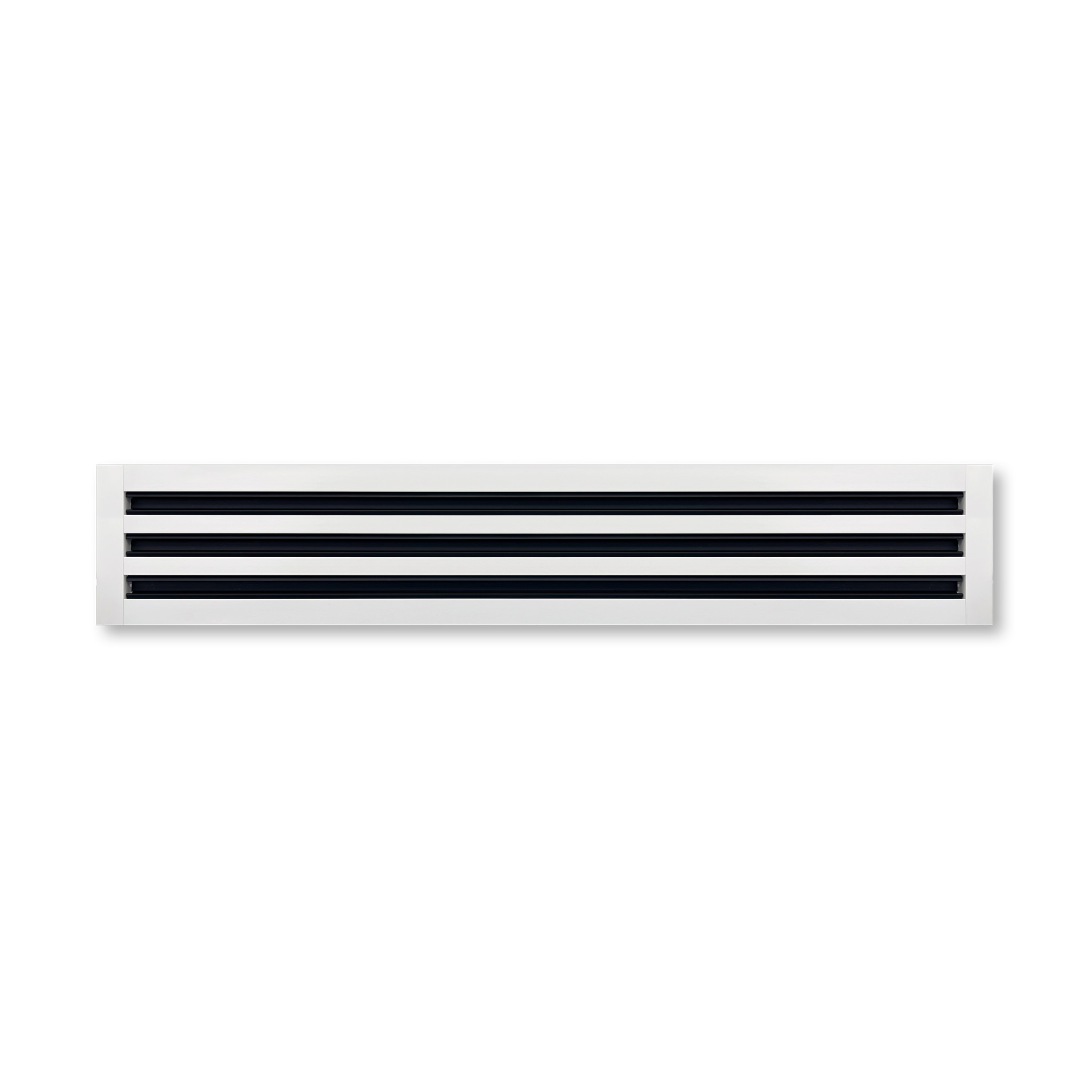 a serene residential bedroom featuring warm greige painted walls light oak hardwood flooring and a large double hung window centered on the far wall dressed with sheer white linen curtains hanging from a matte black rod a queen bed with a white padded headboard sits centered in the room styled with layered white bedding two sage green euro shams a terracotta lumbar pillow and a dark navy plaid wool throw draped across the foot a dark walnut nightstand with a ceramic gourd table lamp flanks the left side of the bed a cream boucle accent chair with a chunky gray knit blanket occupies the right corner a soft ivory area rug with a subtle botanical pattern anchors the seating and bed on the white ceiling positioned directly above the window and running parallel to it is a single linear supply vent cover approximately 36 inches long with exactly three evenly spaced horizontal blades painted white and flush mounted into the ceiling plane bright natural daylight streams through the window architectural interior photography photorealistic high detail