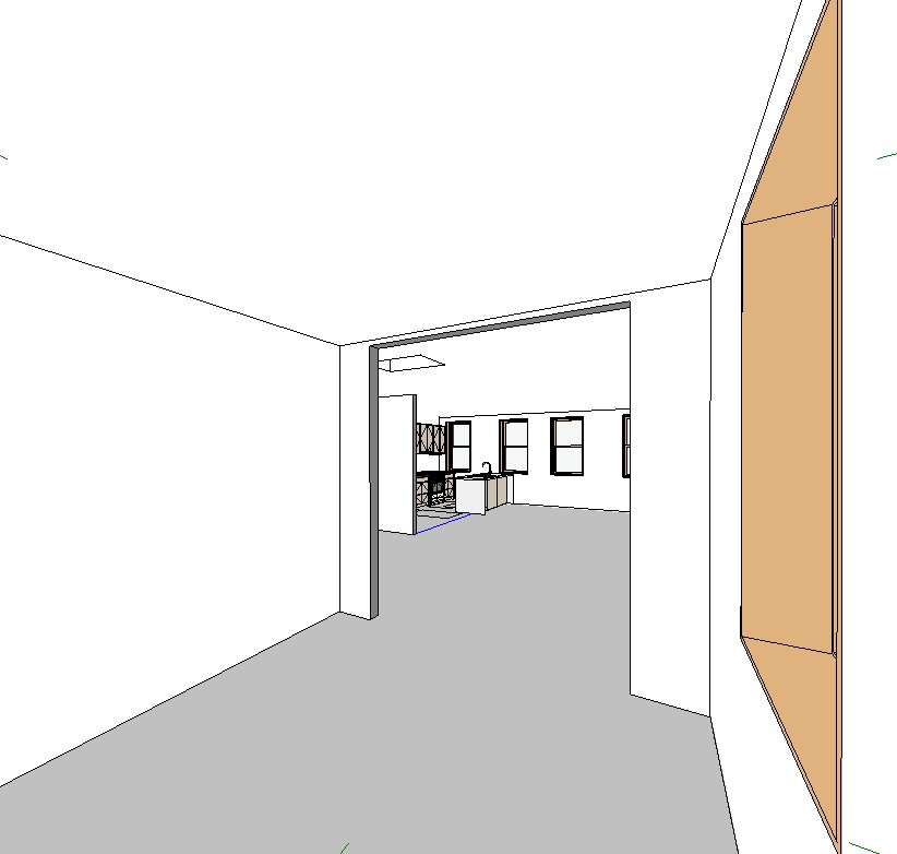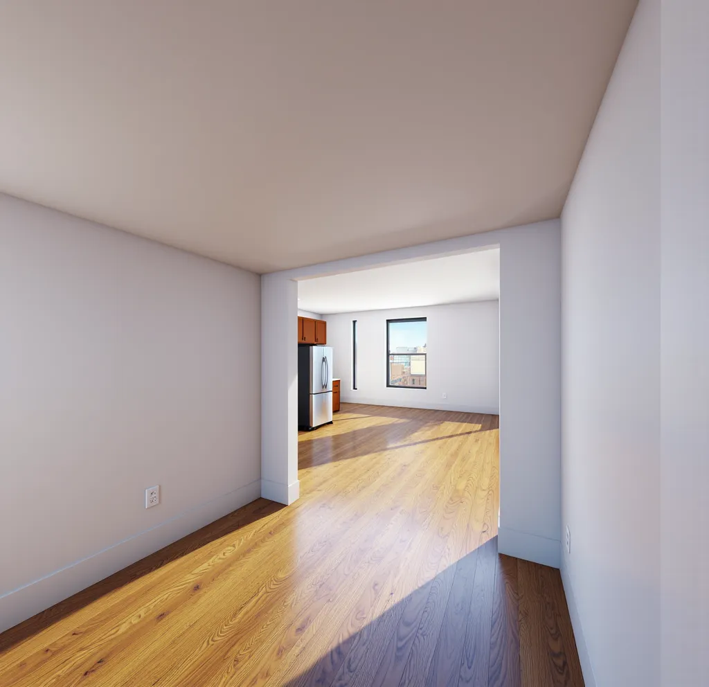 exterior shot this is the interior camera view looking from an alcove into a living room and a kitchen render this view for a brooklyn apartment at 50 grand street with hardwood floors and furniture add computer work desk in foreground make realistic