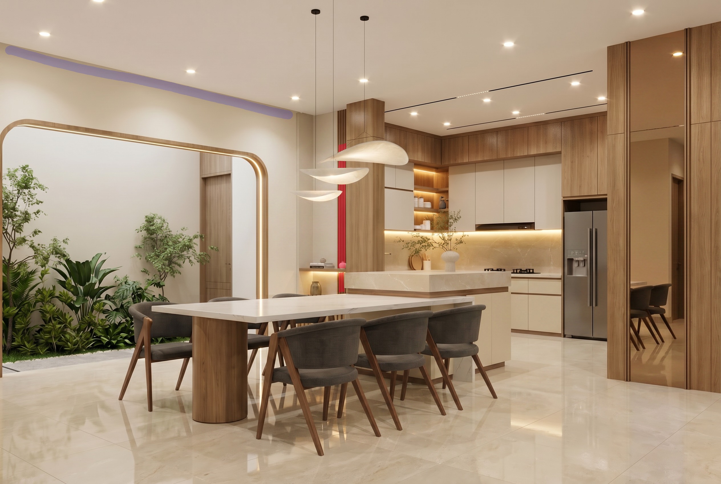 the red color is moru glass and add indrect light follor the blue line there and make slatted to the island cabinet keep the color of it