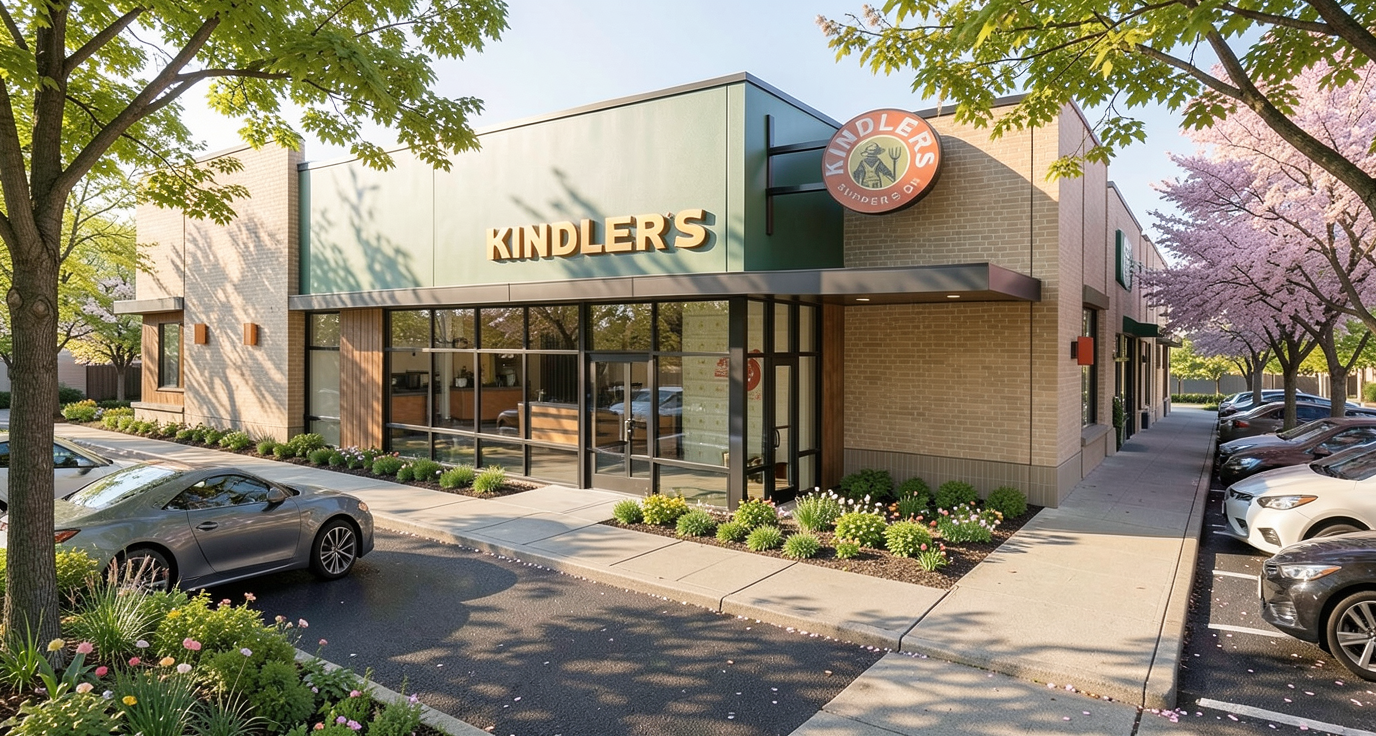 6pm evening a modern two story house with a sleek design and hip roofs featuring grey cut stone veneer window and door frames are black the roof shingles are a dark charcoal color adding contrast with raised seam metal roof accents large windows dominate the facade reflecting the clear blue sky with a few clouds surrounding the house a lush green lawn with colorful flower beds in shades of pink lavender and yellow the atmosphere is serene and welcoming with evening sunlight casting gentle shadows do not modify the massing as shown