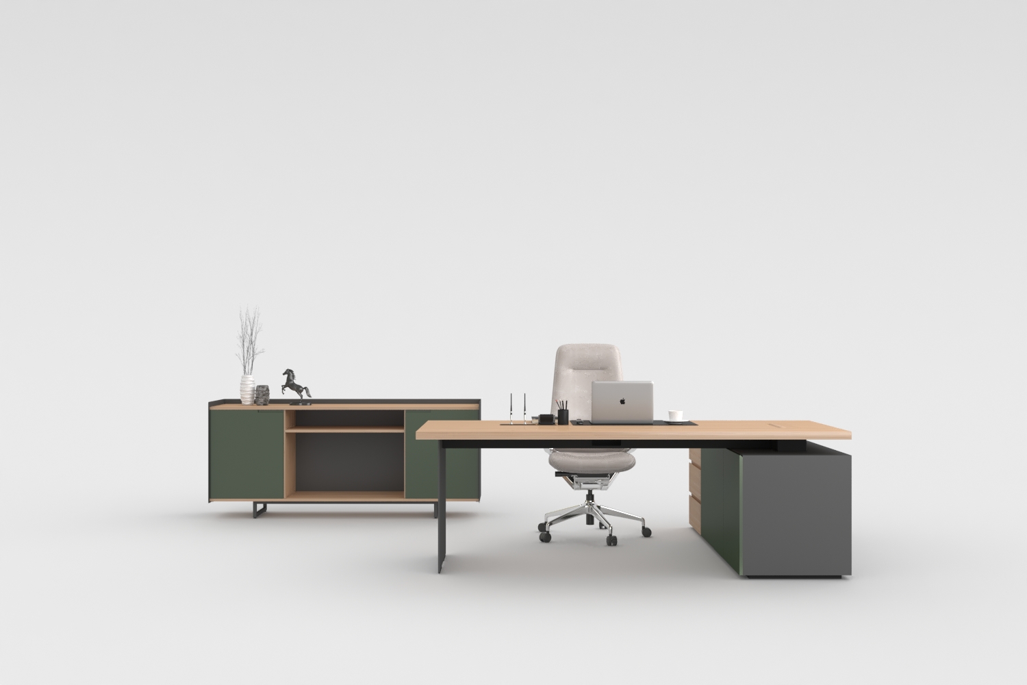 high end commercial furniture photography full scene view of modern executive office desk set with matching sideboard background formed natural oak wood slat wall panel vertical grain solid wood cladding straight clean wood grain lines warm matte finish subtle panel joint details floor seamlessly continues with light oak herringbone parquet creating a unified warm wood interior space lighting soft warm morning sunlight entering from upper right casting a gentle golden glow across the wood panel wall delicate gradient light and shadow across the desk surface subtle fill light from left to outline product silhouette no harsh shadows no overexposure product natural oak tabletop echoes background wood panel forest green and charcoal gray cabinets create sophisticated color contrast against warm timber backdrop cream white ergonomic chair with fine textile detail macbook visible on desk white ceramic vase on sideboard quality 8k ultra hd luxury furniture showroom photography color palette warm beige natural oak forest green charcoal sophisticated and grounded mood editorial magazine style ar 16 9 style raw q 2 v 7