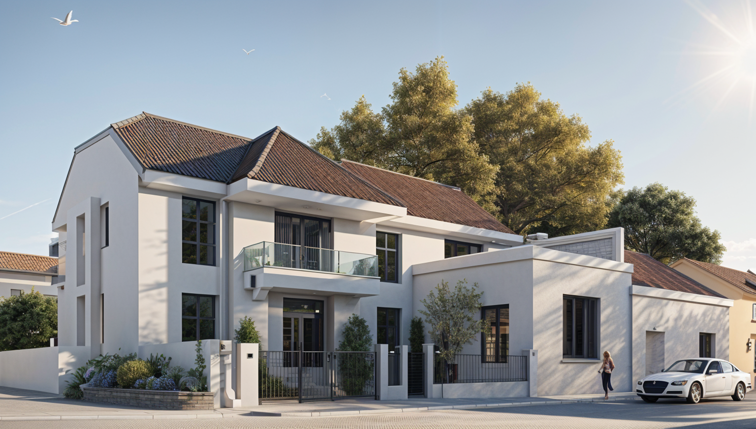 render a modern outdoor patio with a sleek black metal pergola and white pillars creating a sophisticated open space the floor is a dark gray stone tile enhancing an elegant vibe the spiral staircase is a warm beige stone adding texture and contrast the background walls are painted in a neutral gray include a vibrant blue and orange awning for a pop of color the dining area hosts a wooden table surrounded by comfortable dark brown chairs perfect for social gatherings set a relaxed contemporary atmosphere with natural lighting and subtle shadows
