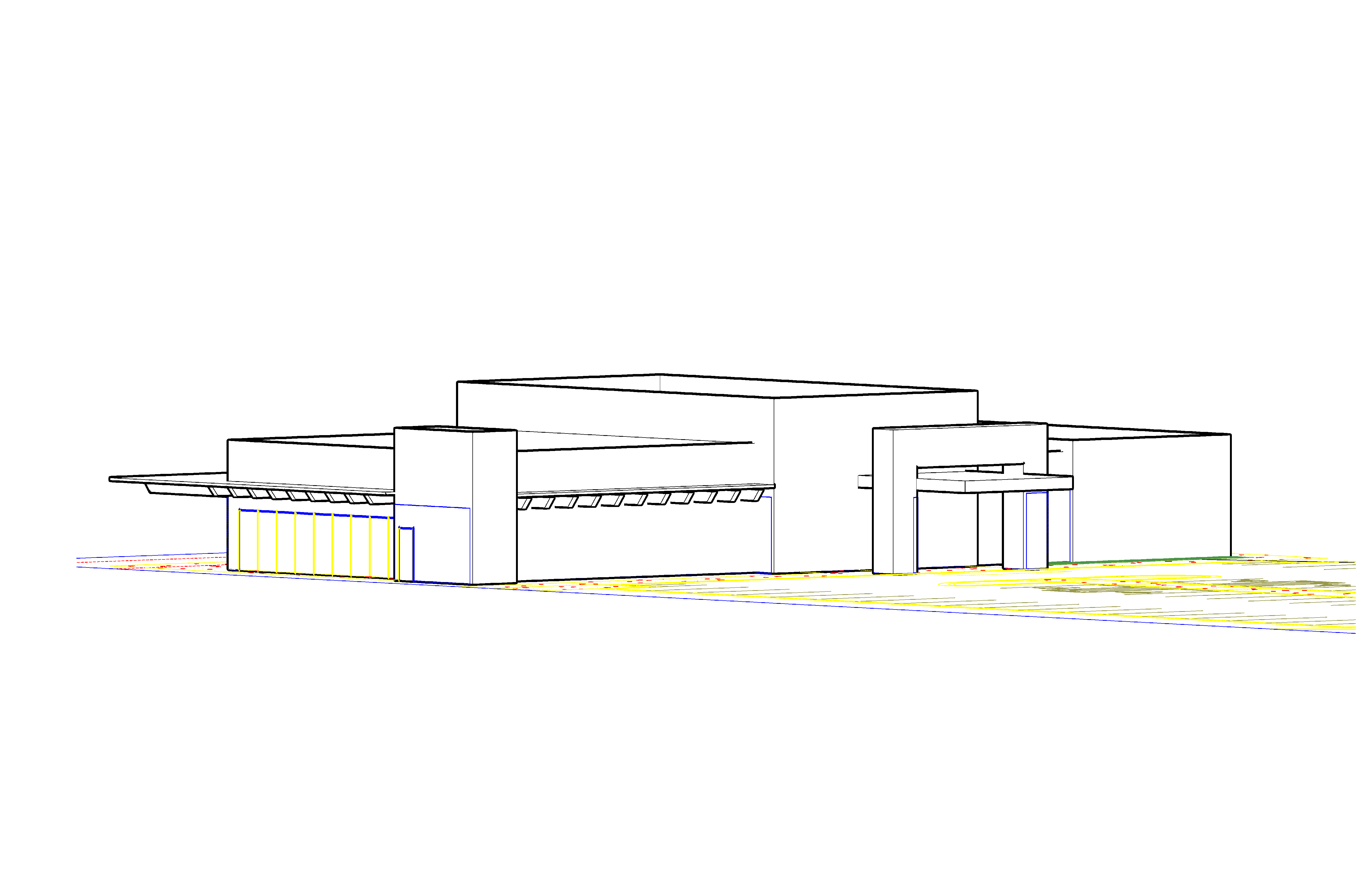 modernist exterior shot sandstone blocks at entrance facade place a parking lot in front of the building the setting is the high desert architecture