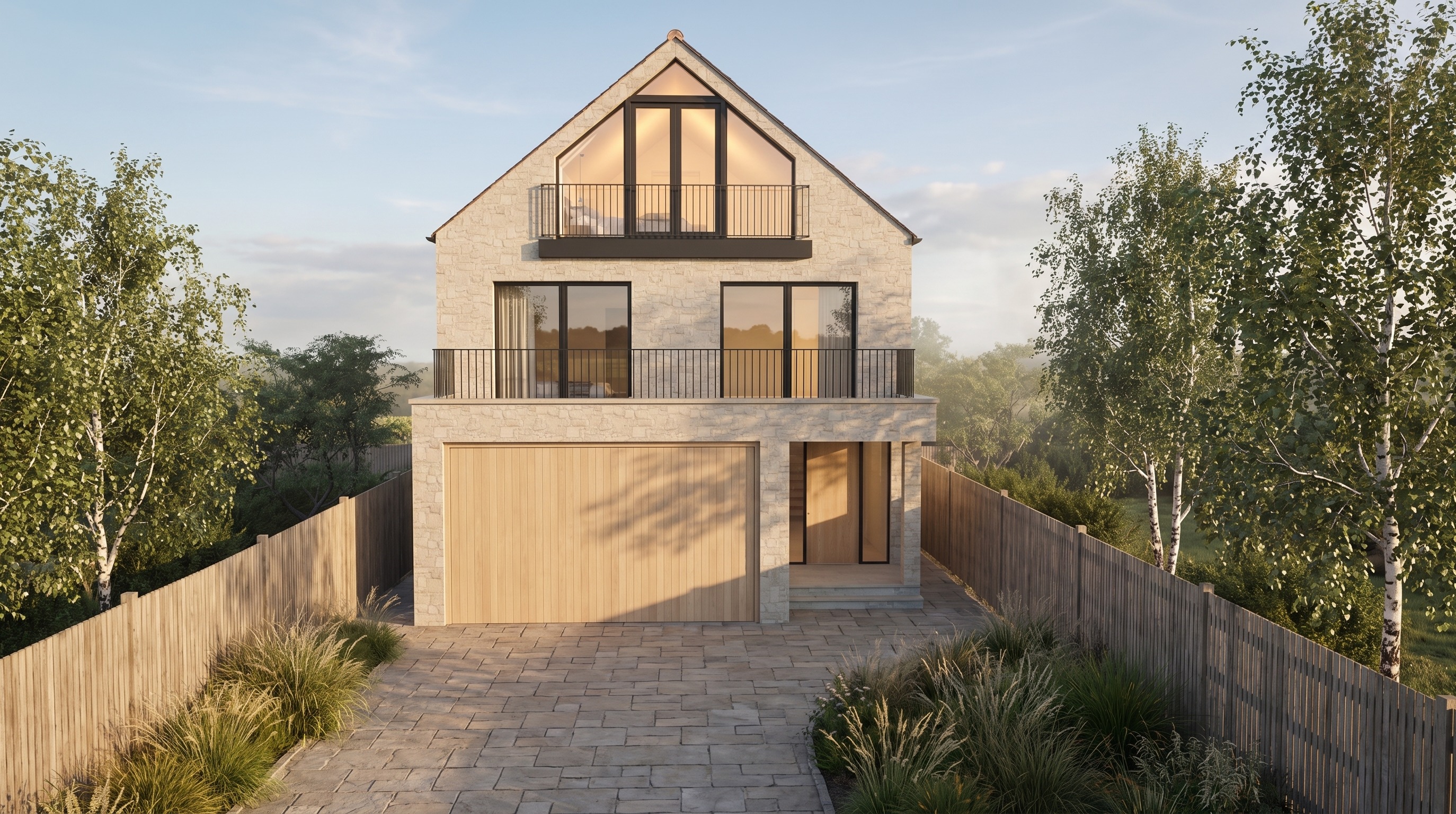 photorealistic architectural render late afternoon golden hour light warm directional sun soft atmospheric haze contemporary coastal family home clad in hand laid reconstituted limestone with fine mortar joints and subtle tonal variation matte black powder coated aluminium window frames driveway laid in small format natural stone setts or reclaimed cobbles with tight joints arranged in three clear zones a single parking bay on the left sized for one car a narrow central planting strip offset slightly to the right with low ornamental grasses and clipped evergreens and a pedestrian walking path of stone flags running along the right hand side leading to the front door planting kept low and restrained hugging the edges of the driveway so the full width remains usable timber batten boundary fence weathered to warm grey mature silver birch trees framing the property at the boundary only not encroaching on the driveway first floor master suite visible through the full height gable glazing with soft interior warmth a contemporary upholstered bed with linen bedding bedside pendant lighting and floor to ceiling sheer linen curtains drawn partially to the sides framing the glazing elegantly middle floor bedroom interiors visible through the two side windows contemporary bedrooms with upholstered headboards warm ambient lighting layered bedding and soft curtains matte black vertical bar handle on the pale oak timber front door editorial architectural photography 35mm lens eye level perspective ultra realistic shallow depth of field high dynamic range