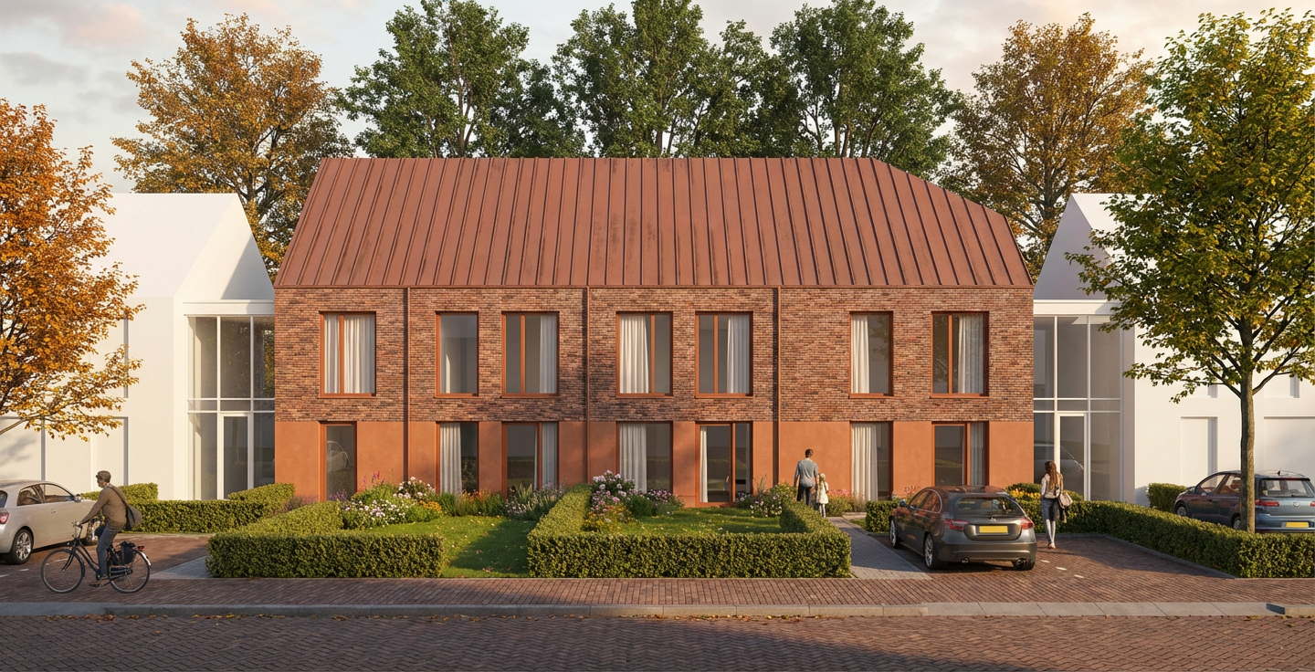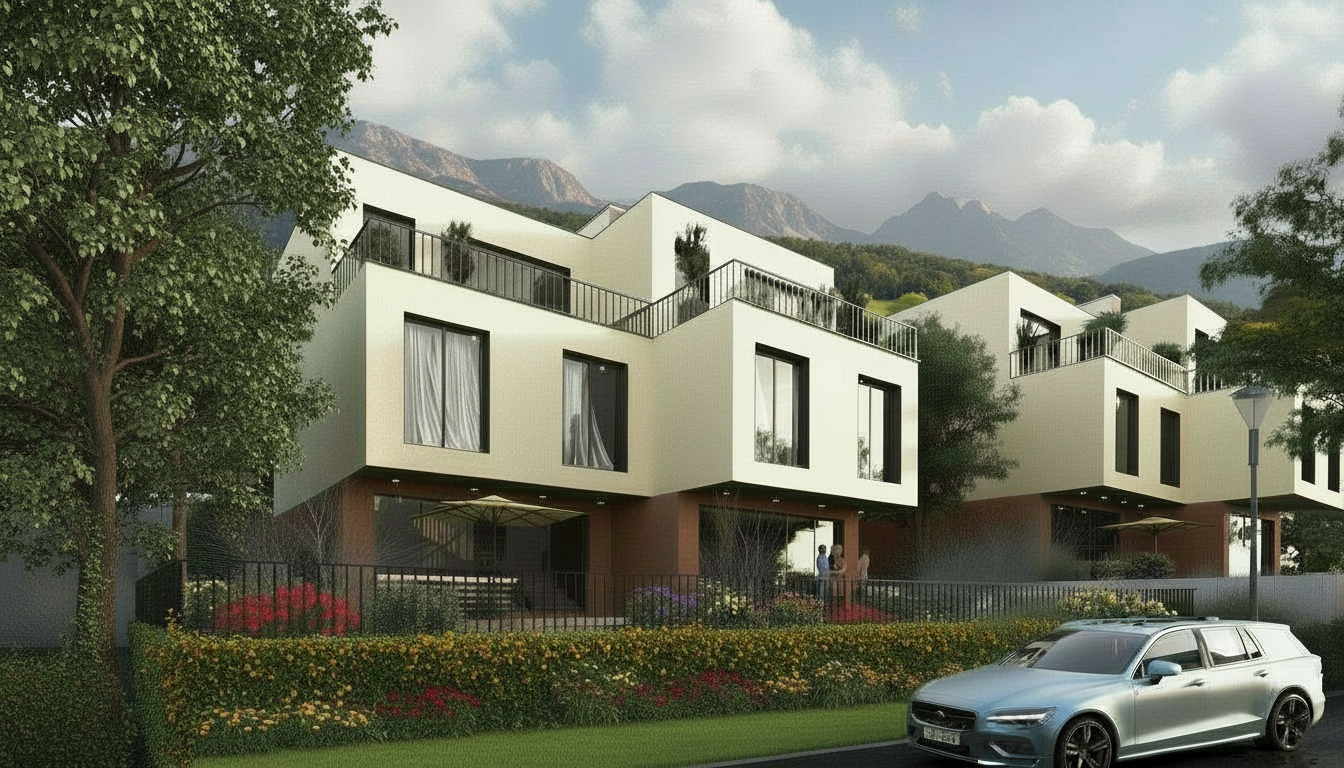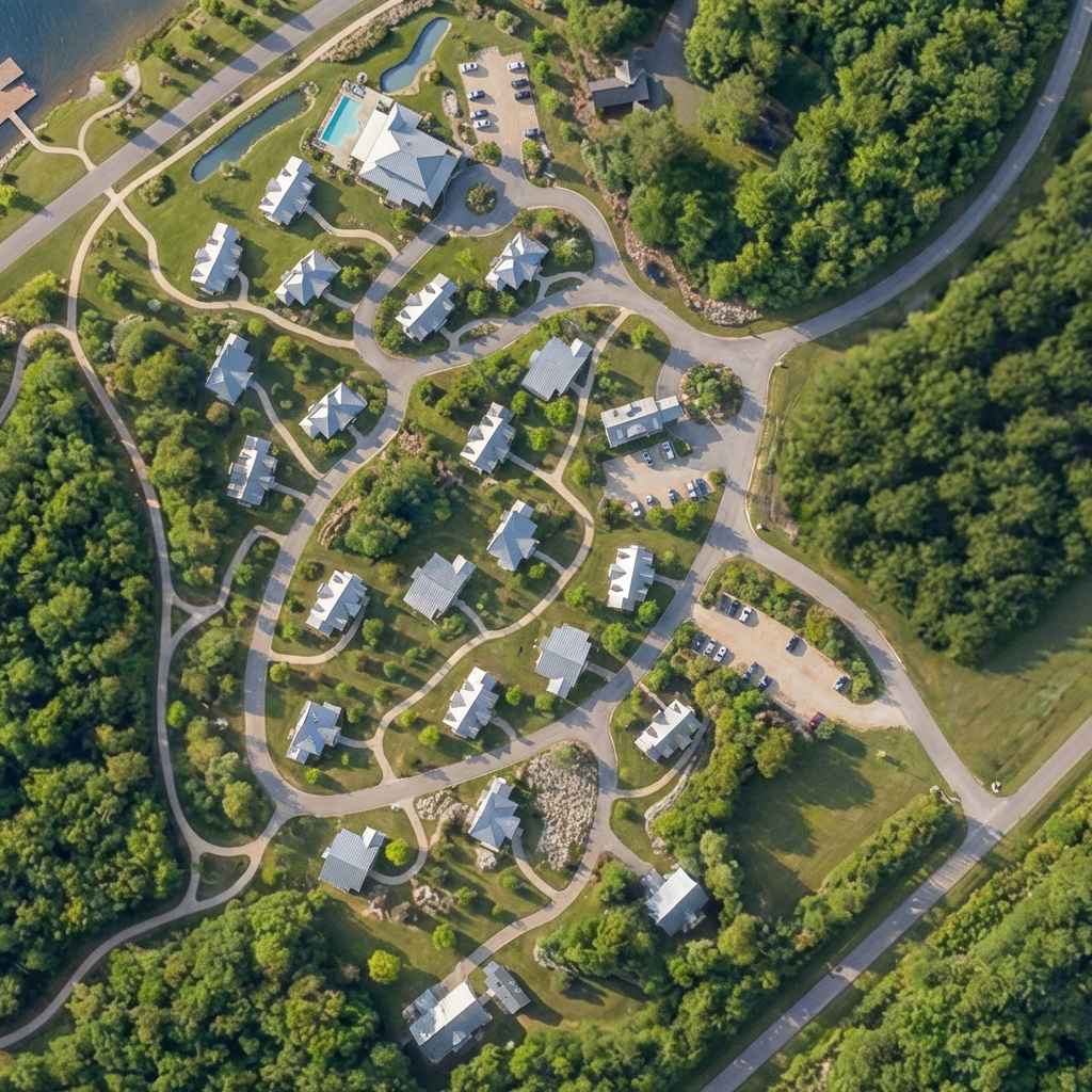 top view site map natural lighting keep the size as is keep the aerial dead on top view add a few cars in the parking lots metal seamed roofs on the houses