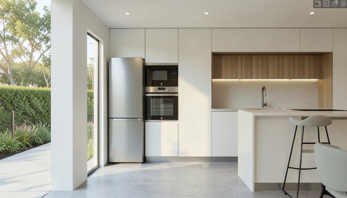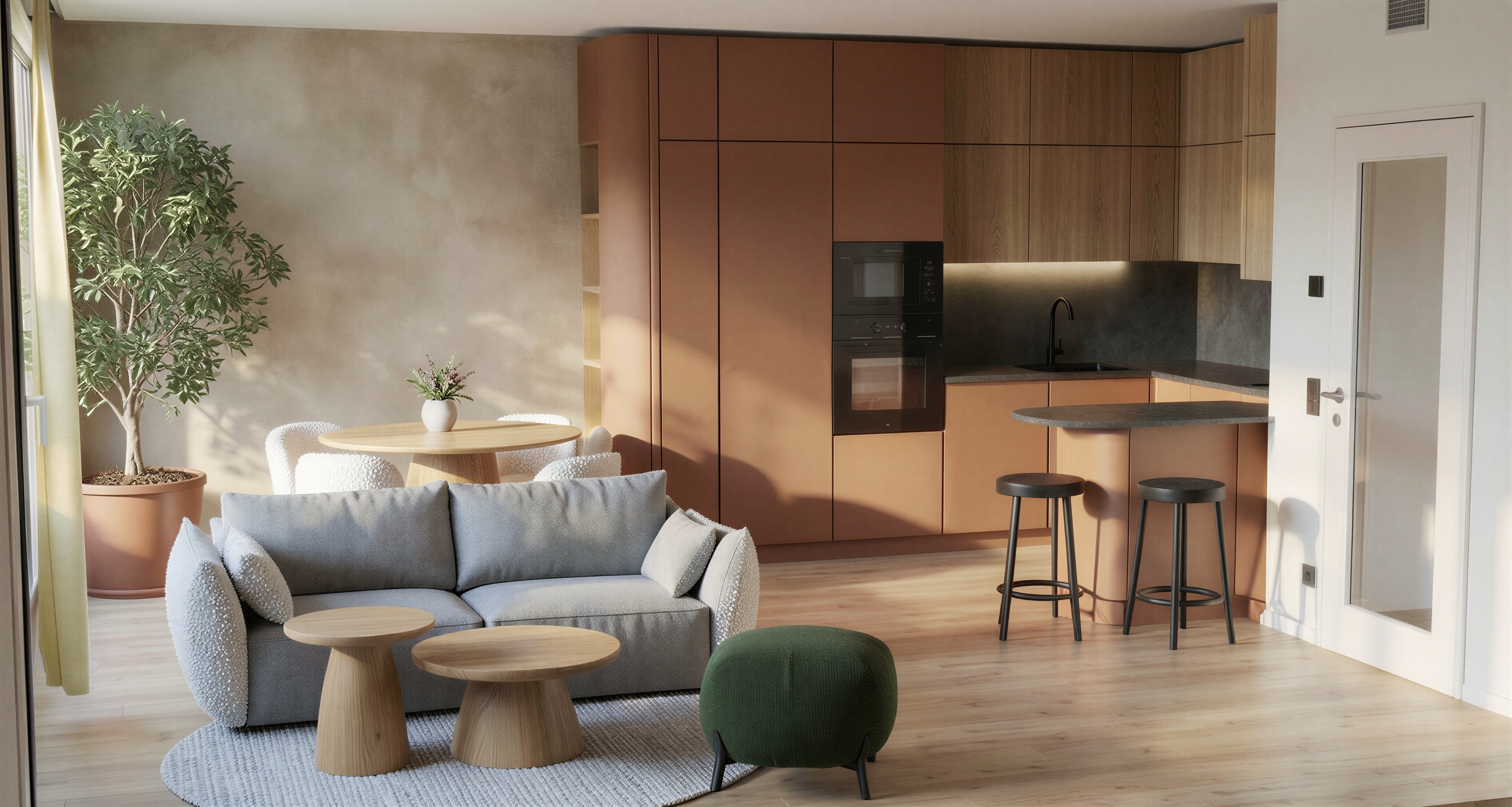 modify the image while strictly preserving the original composition camera angle layout furniture positions proportions and overall color palette sofa change the texture of the sofa armrests so that they have exactly the same fabric texture and color as the main sofa upholstery remove the white textured boucl material on the armrests and replace it with the same grey sofa fabric as the seat and backrest the sofa should appear as one continuous uniform material kitchen led lighting extend the led strip lighting under the upper kitchen cabinets so that it runs continuously along the entire length of the kitchen the led lighting should illuminate the full backsplash and countertop evenly not just the section above the sink the light should be soft integrated and realistic backsplash wall material change the backsplash and wall surface in the kitchen so that it uses the same plaster texture as the wall on the left side of the room the kitchen wall should have the same warm beige decorative plaster finish with subtle natural variations and soft texture matching the left wall exactly