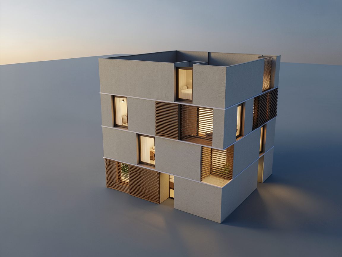 preserve all existing elements visible in the uploaded image and creatively increase the number and arrangement of windows across the facade while keeping the overall structure intact the building should clearly read as a modern apartment allow soft subtle interior lighting to glow from the windows use wooden louvers and or railings very sparingly as minor accents without altering the original building form or camera view