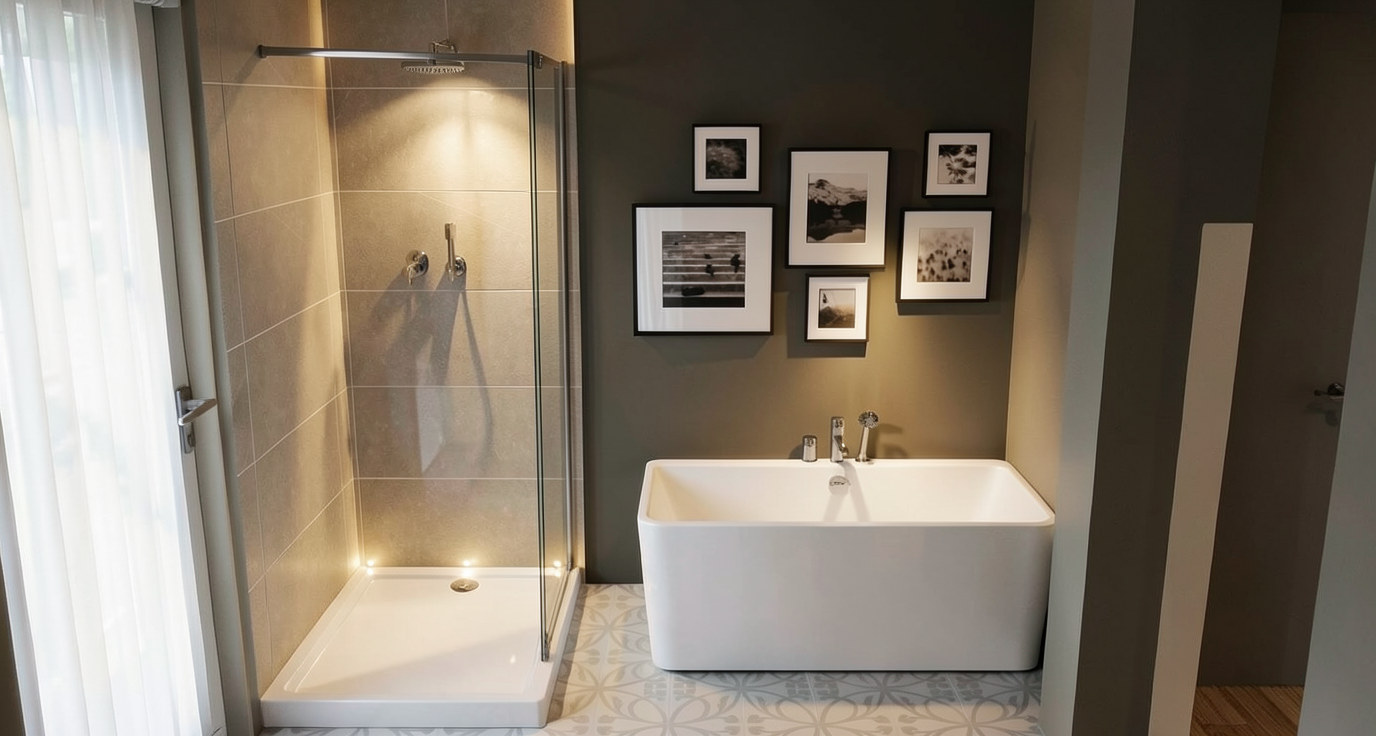 make this model 3d look like realistic interior photography render warm natural materials microcement beige off white on the walls japandi style minimalistic behaind the mirror there are stone look tiles