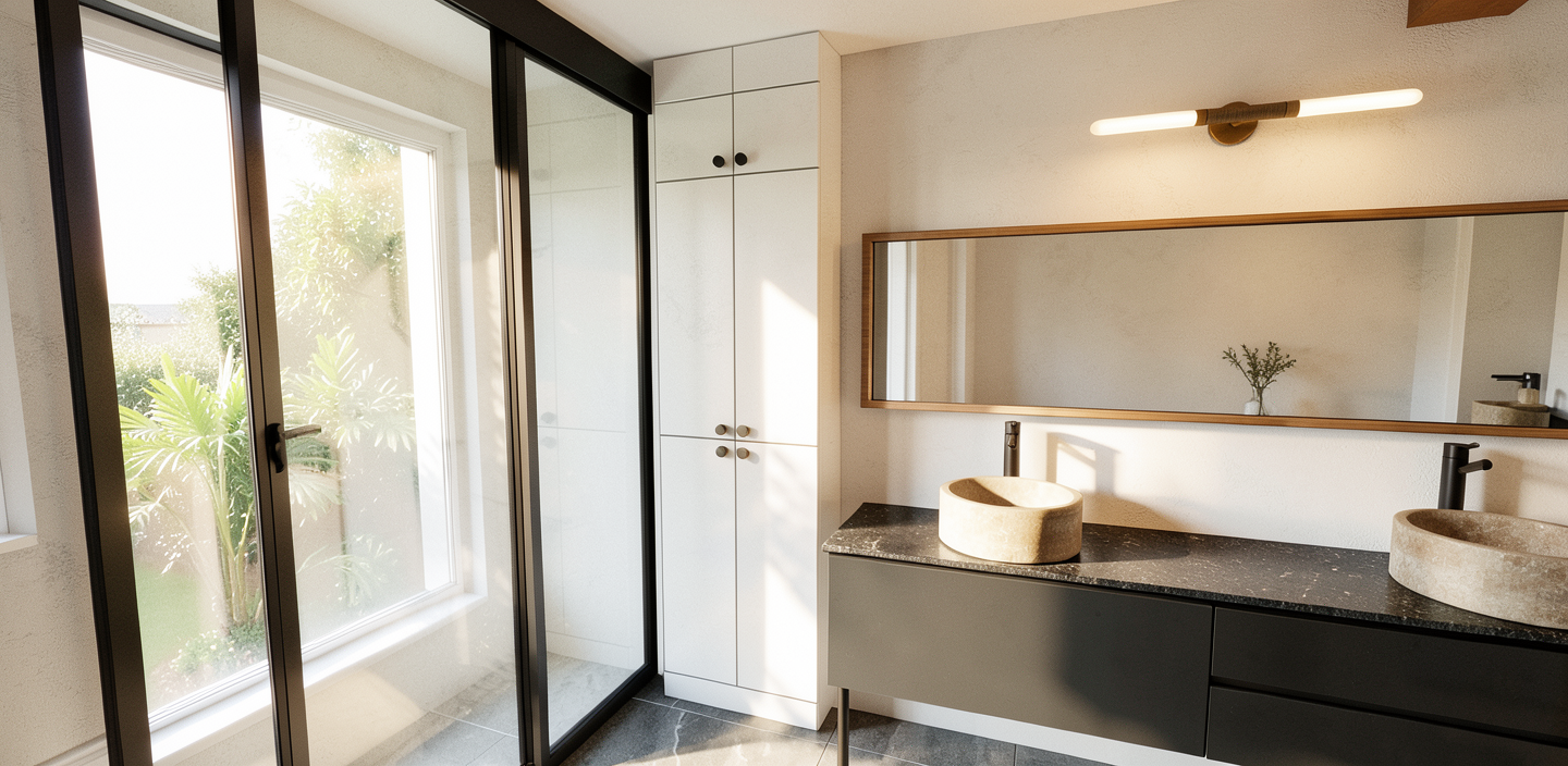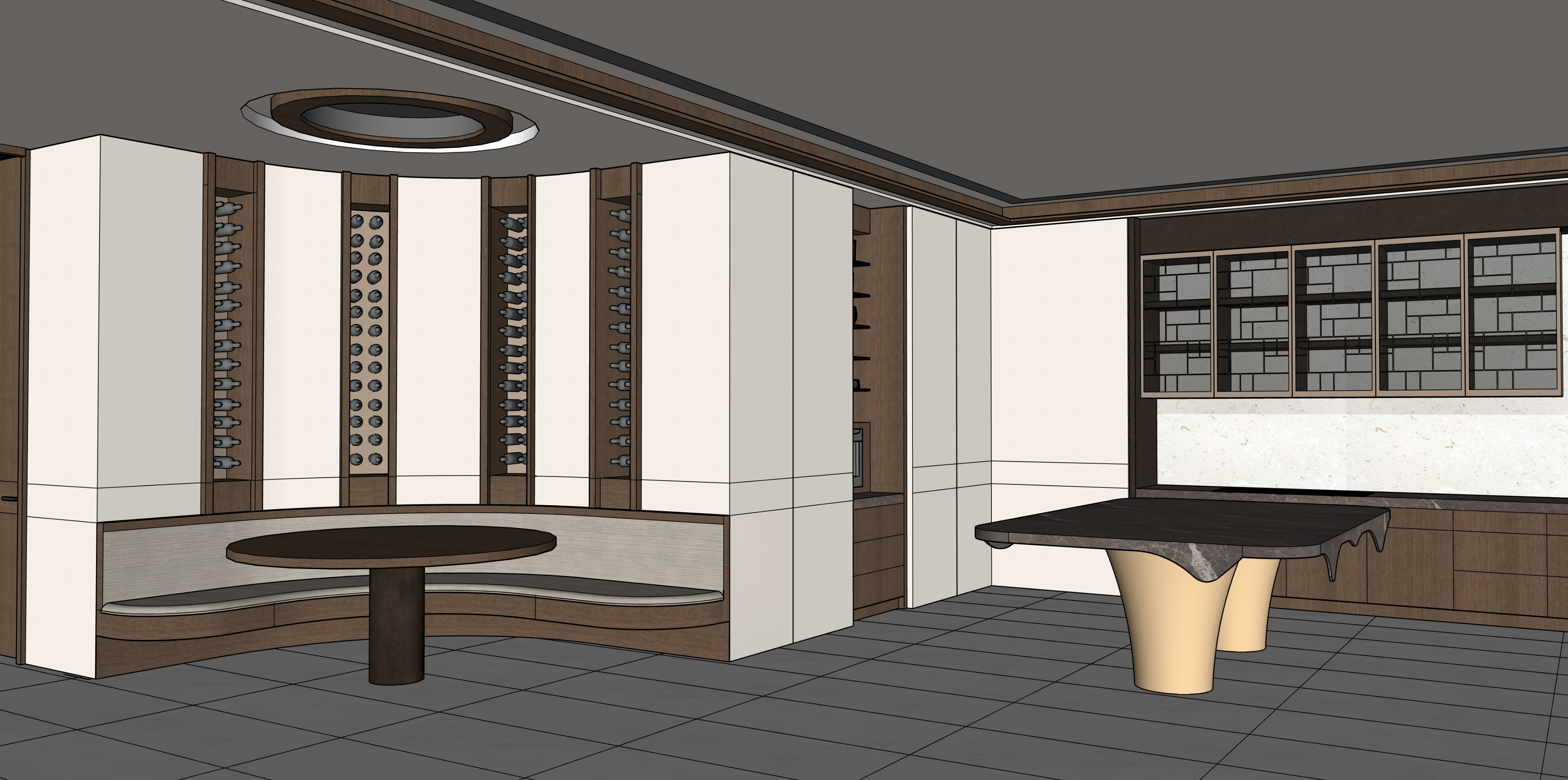 a luxury high end residential view of the kitchen and dining room please copy the exact layout usining the sketchup rendering image provided add three dining chairs to the round dining banquette add four chairs two on either side of the counter height kitchen island reference the concept image for the kitchen island but please swap out the materials to align with the materials pictured and labeled ceiling with have a slight wood cover surrounding the perimeter with cove lighting add a chandelier to the circular wood ceiling detail above the round dining table four bvertical wine columns on the rounded dining banquette wall with the same counter stone behind and backlit