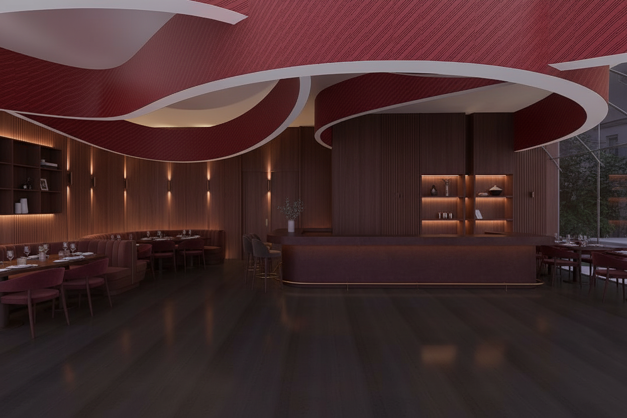 render the existing restaurant interior as a dark premium fine dining space inside a contemporary glasshouse preserve all existing geometry exactly use a low luminance palette of oxblood wine red dark terracotta burnt umber and deep walnut woods cream and stone tones are minimal and dark toned used only to highlight form create a curved monolithic bar in matte darkened stone or tinted plaster behind it apply full height vertically segmented deep wood panels with subtle warm backlit shelving sparse and controlled walls combine dark warm plaster microcement with integrated vertical wooden accents and ribbed wood panels matte and tactile revealed by soft concealed grazing light enhance the ceiling with a suspended flowing perforated metal mesh installation in deep red oxidized copper tones softly and unevenly illuminated no visible spotlights add high end fine dining furniture dark wood tables upholstered chairs in oxblood or deep neutrals curved banquettes and elegant upholstered bar stools layout is spacious and curated lighting is low warm and cinematic with deep shadows and controlled reflections style is modern luxury hospitality intimate and restrained ultra realistic architectural render high material fidelity avoid bright whites cool tones glossy finishes industrial or casual elements over lighting
